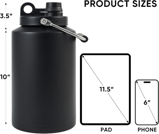 Insulated Jug with Handle, One Gallon, 128Oz Stainless Steel, Large Double Vacuum Water Bottle for Hot & Cold Drinks, Wide Mouth, Sweat Proof, Great for Travel, Hiking & Camping, Black