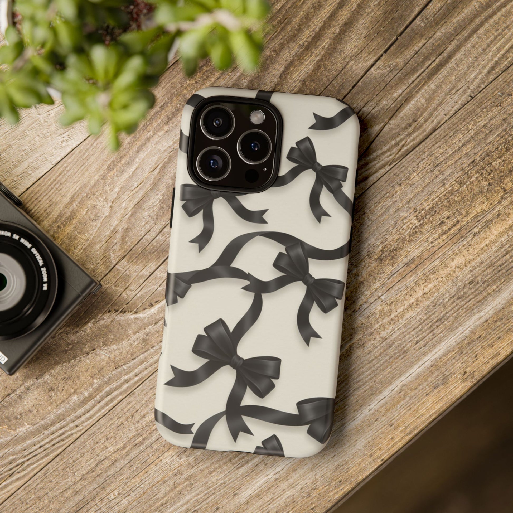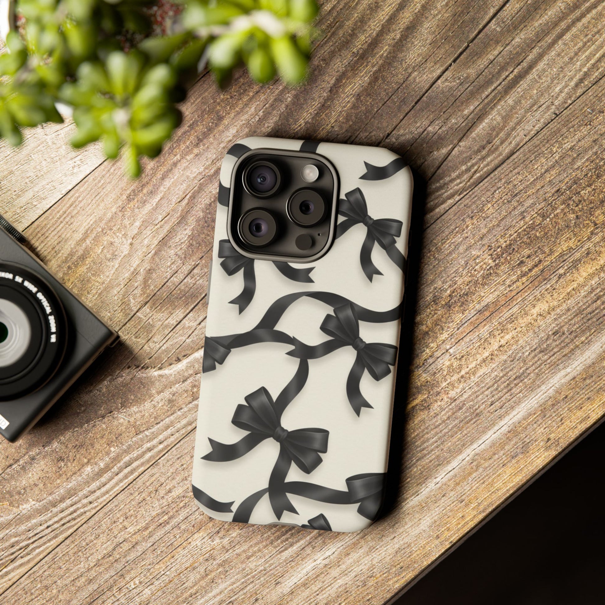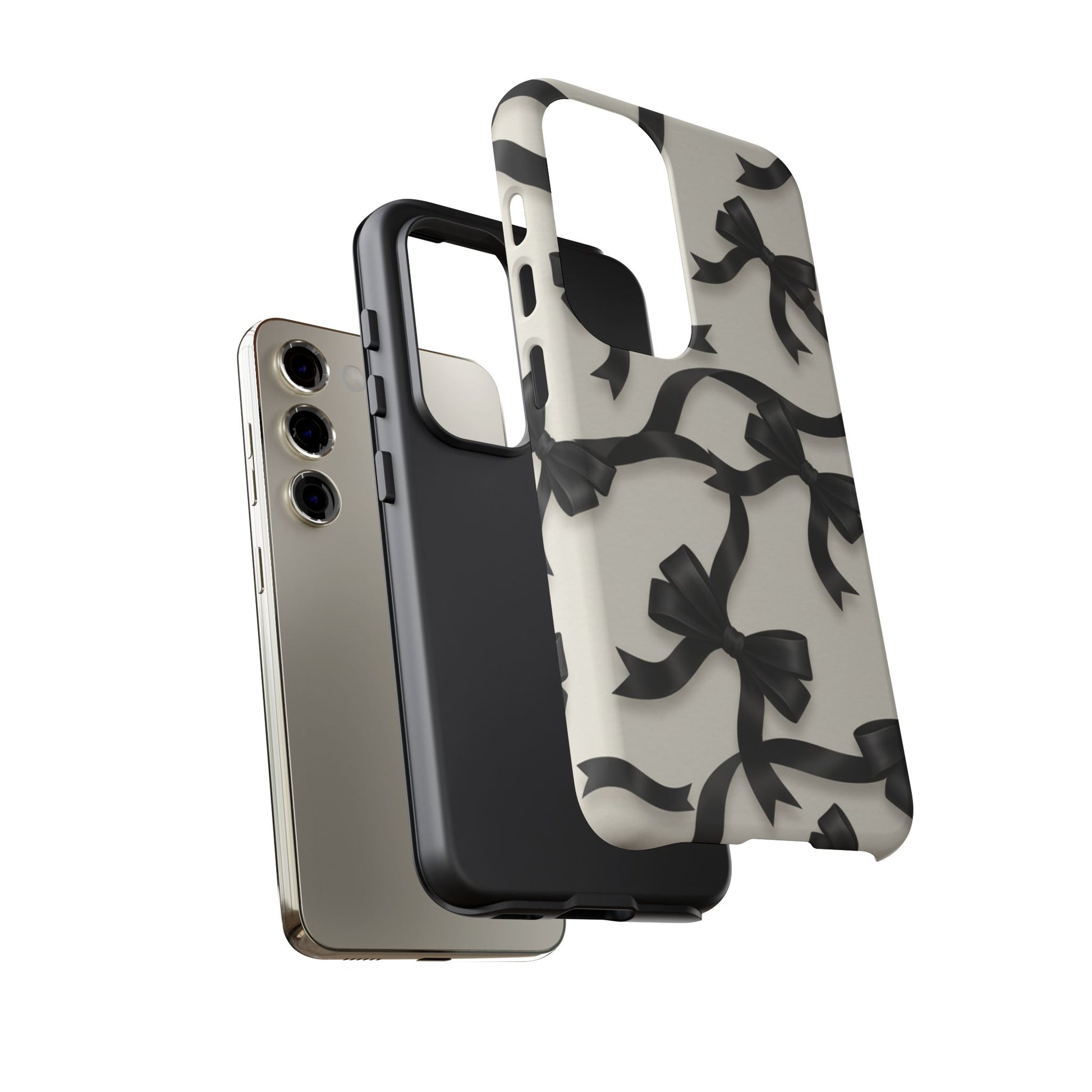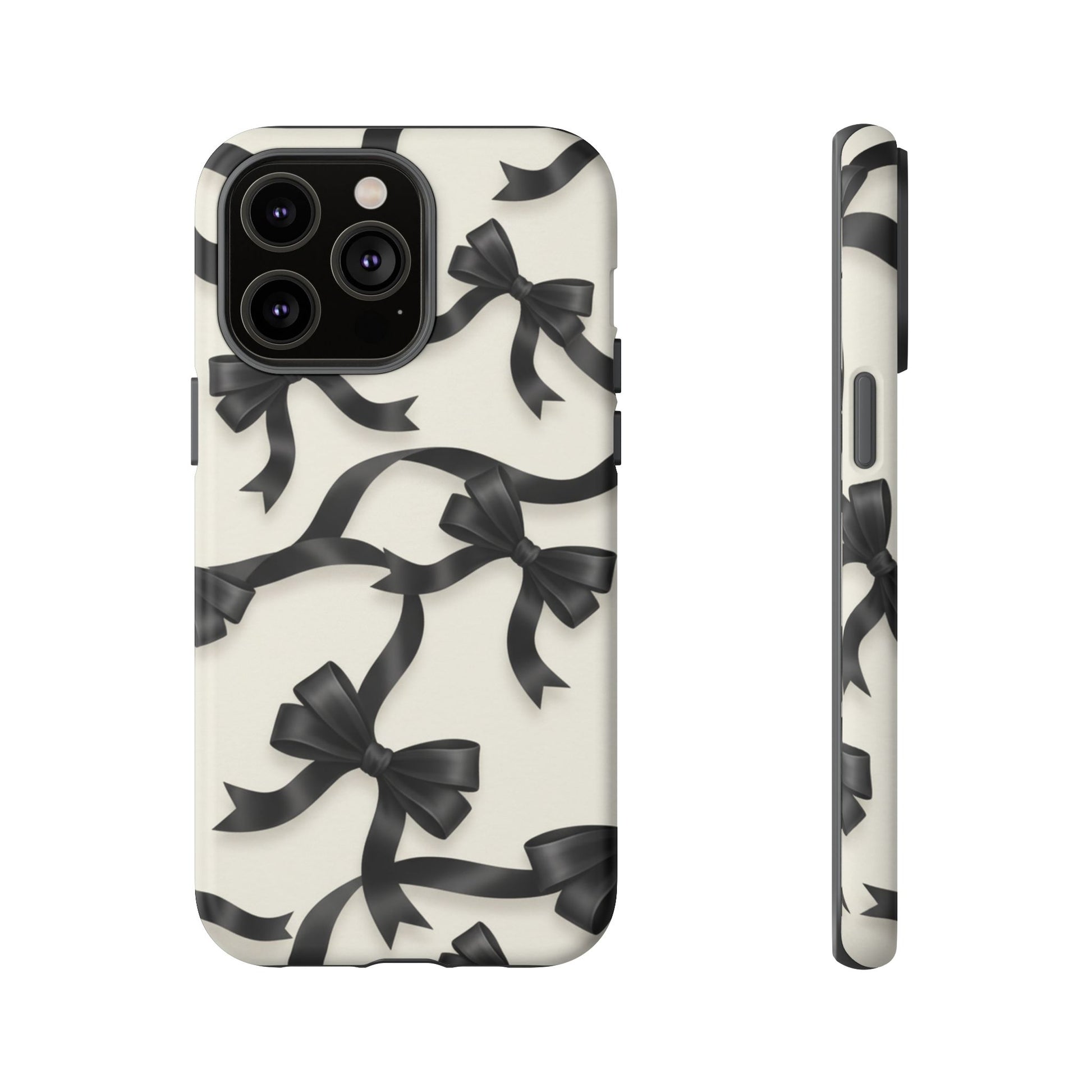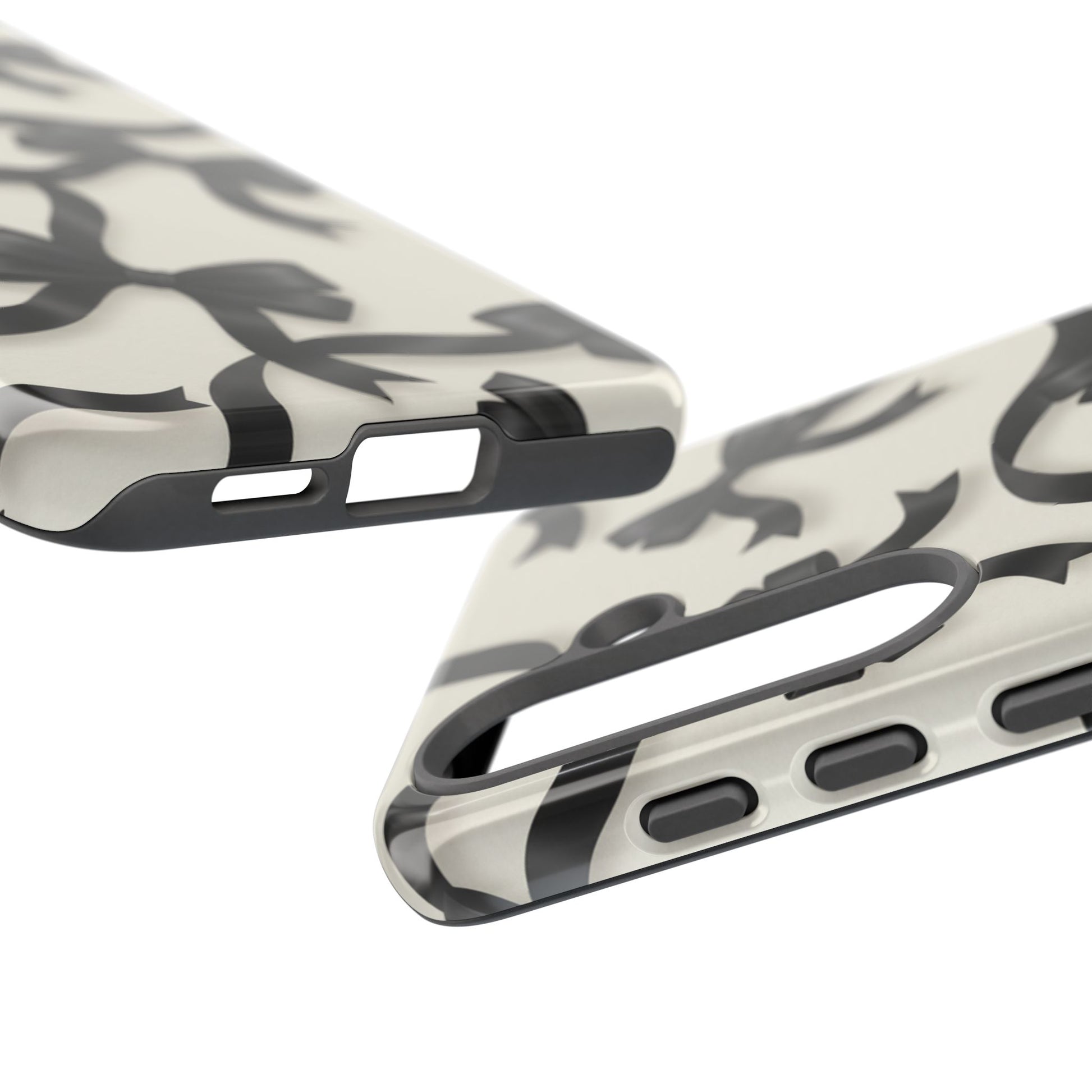 Add a touch of understated elegance to your everyday carry with this black ribbon bow phone case. Featuring flowing satin-style bows on a soft neutral background, this design blends vintage charm with modern minimalism for a look that’s both feminine and refined.