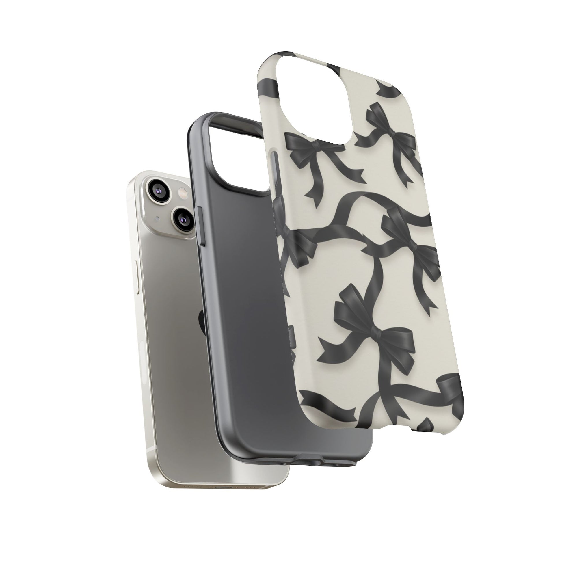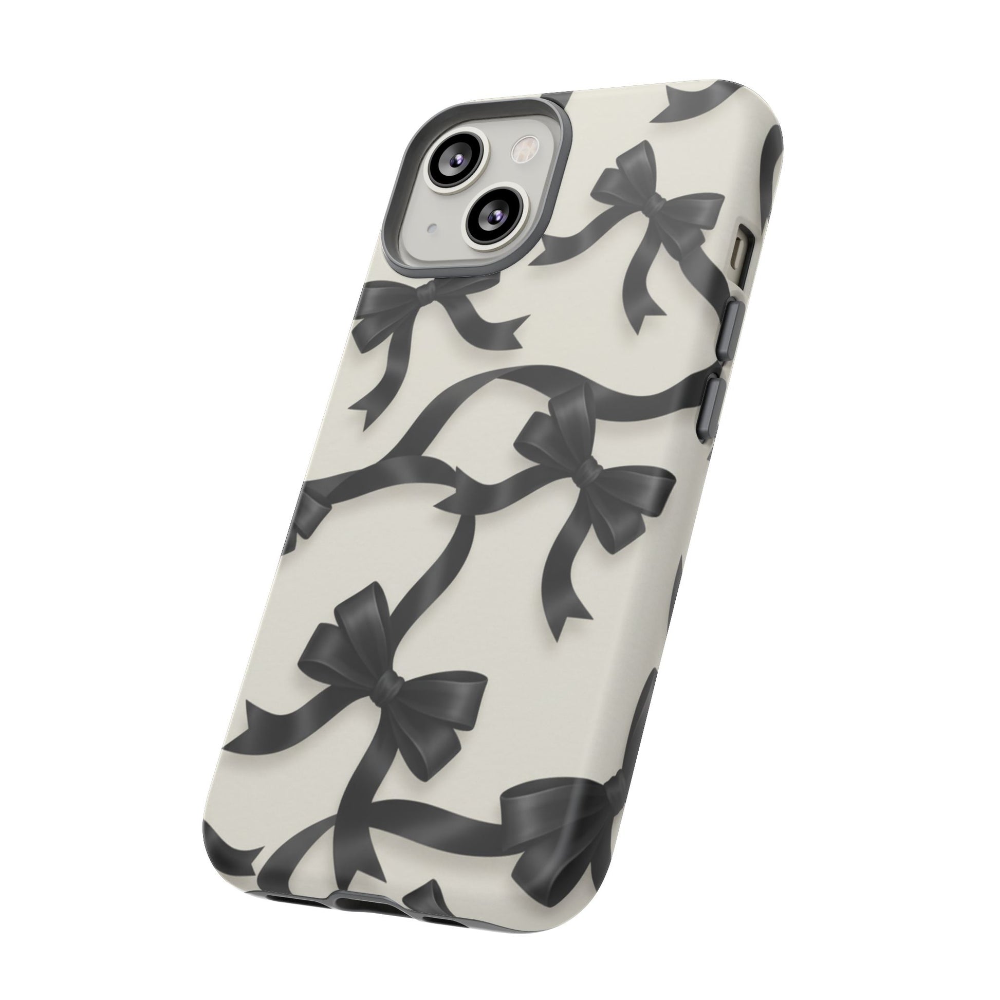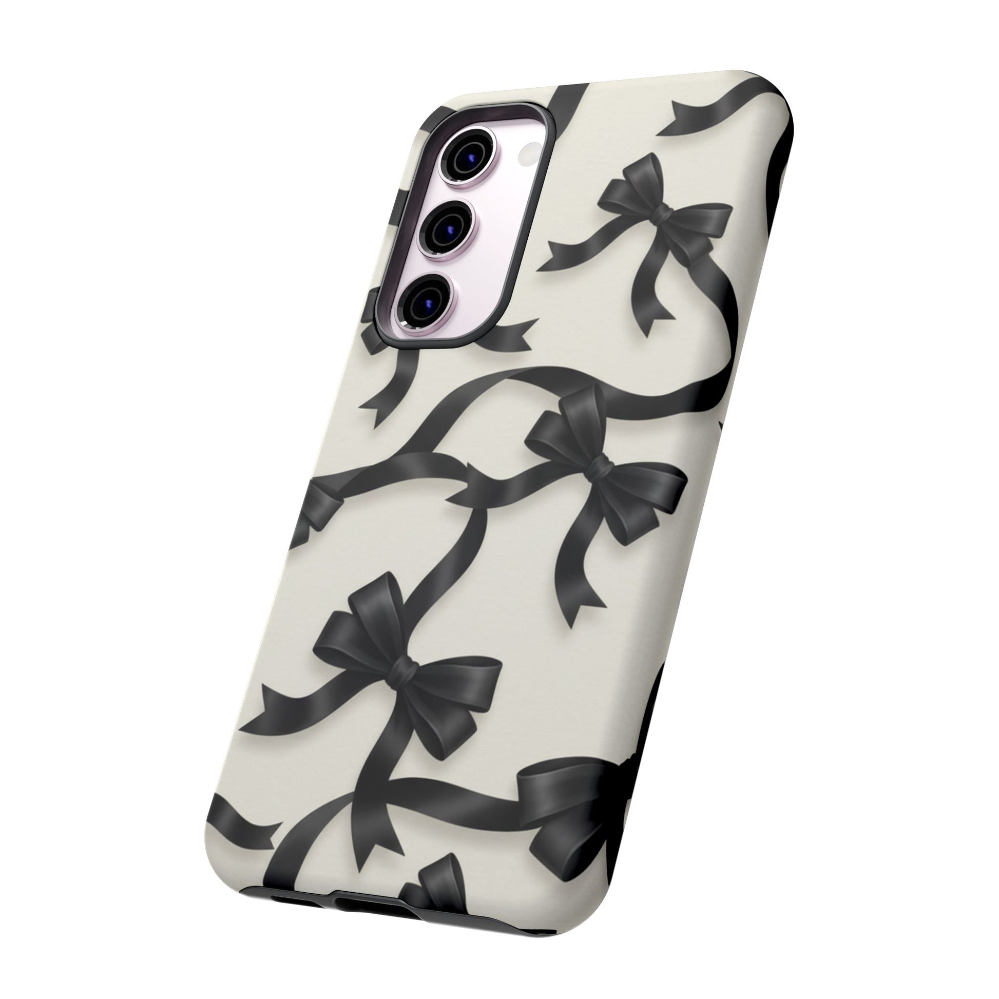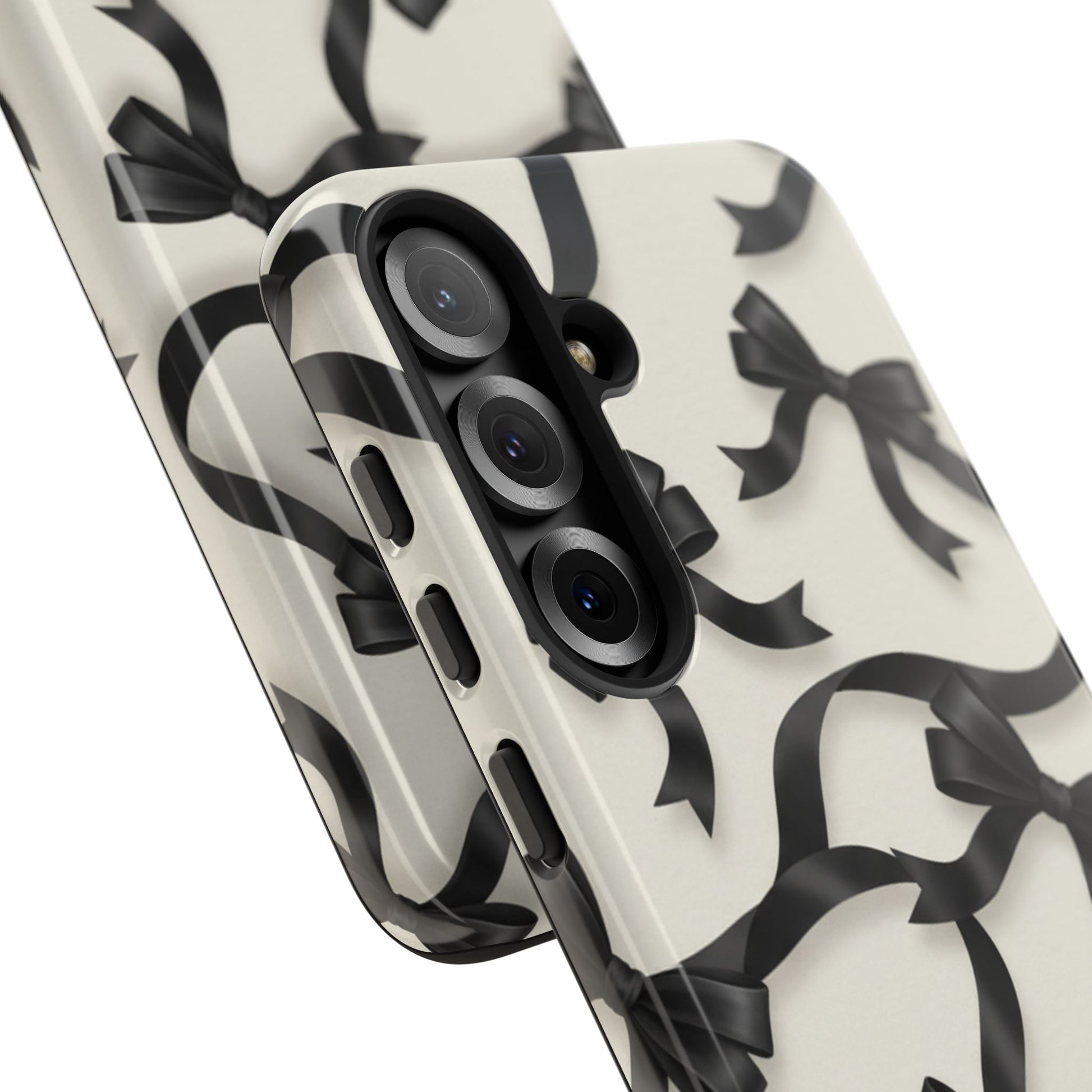 Add a touch of understated elegance to your everyday carry with this black ribbon bow phone case. Featuring flowing satin-style bows on a soft neutral background, this design blends vintage charm with modern minimalism for a look that’s both feminine and refined.