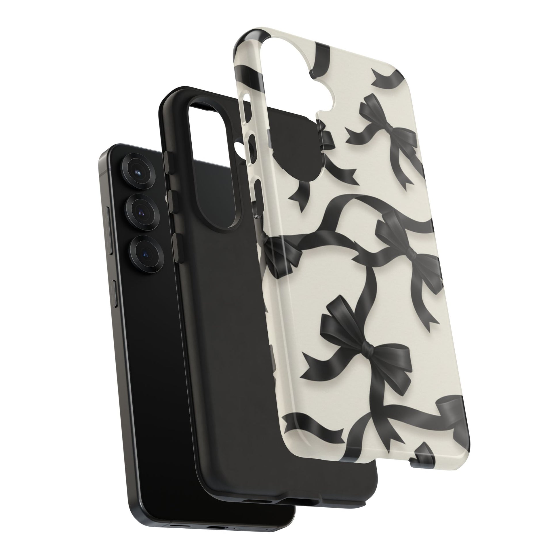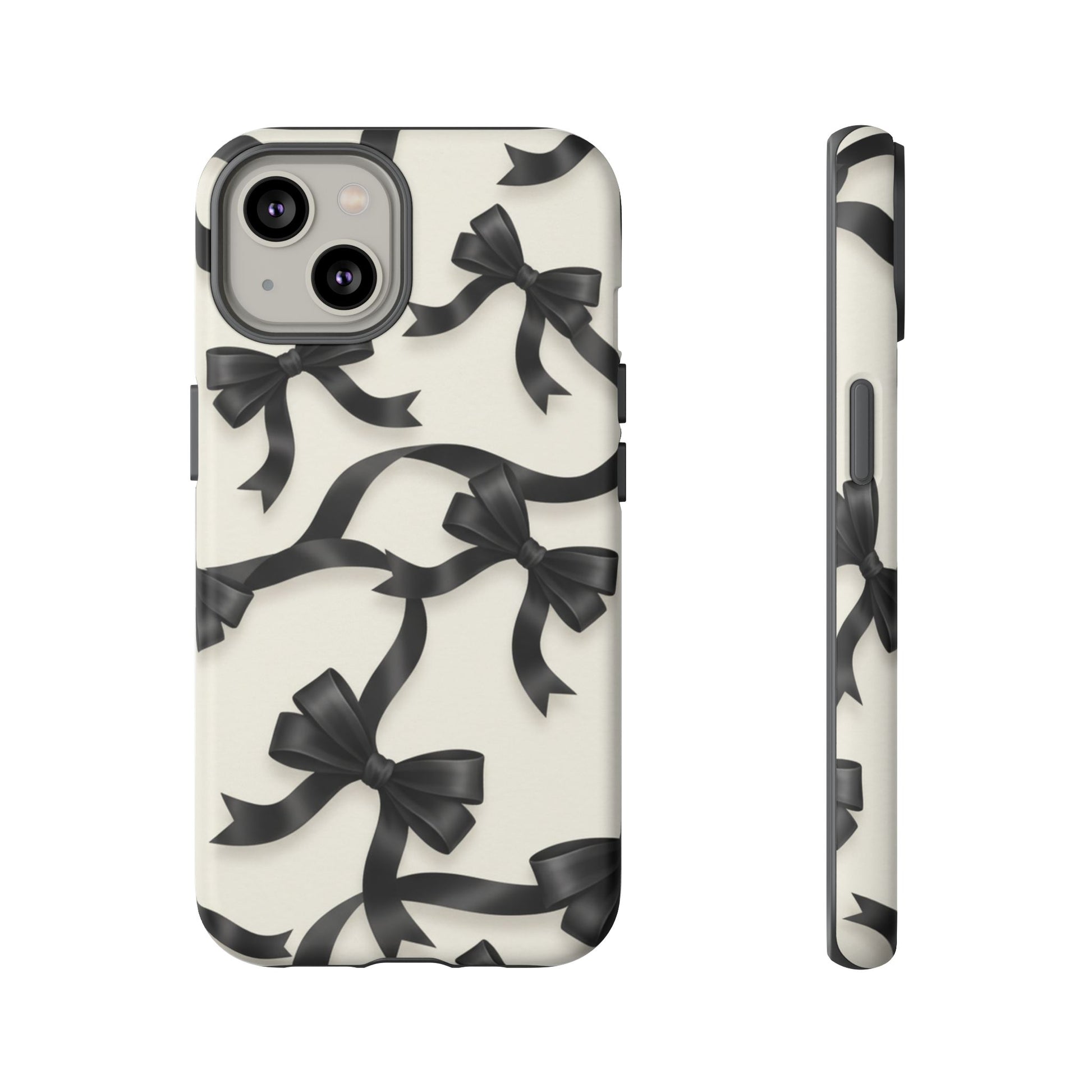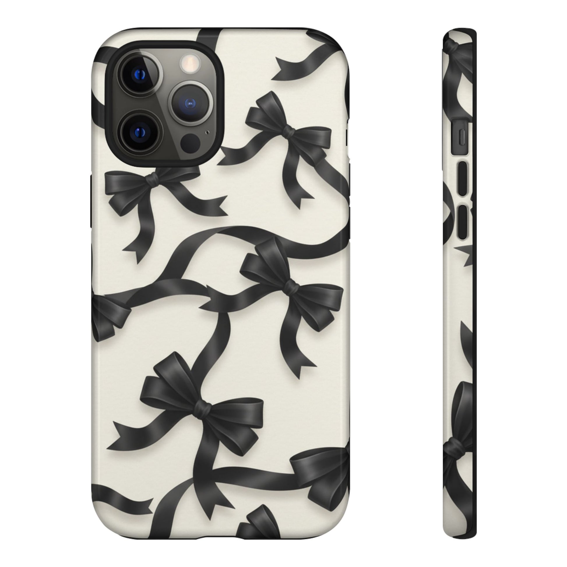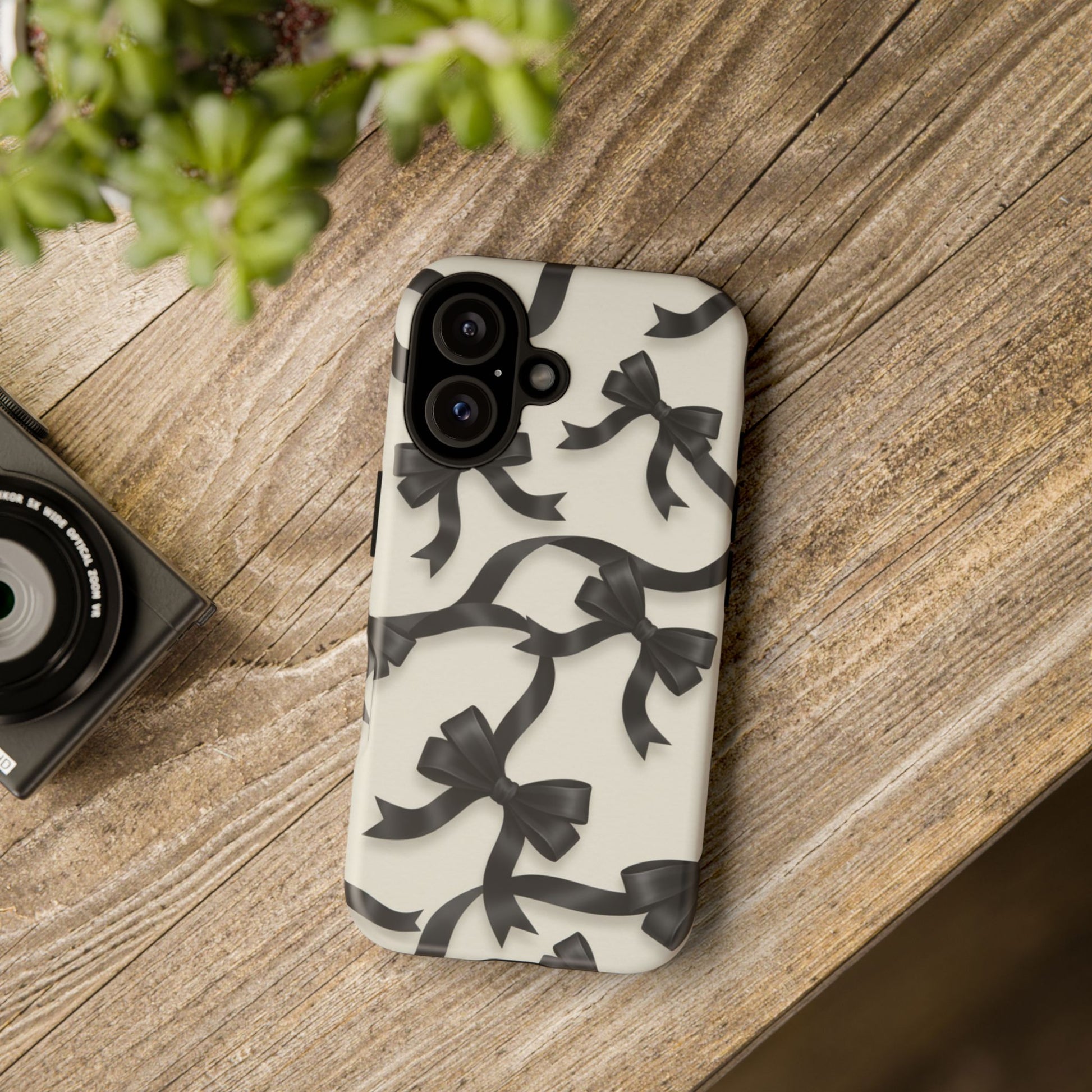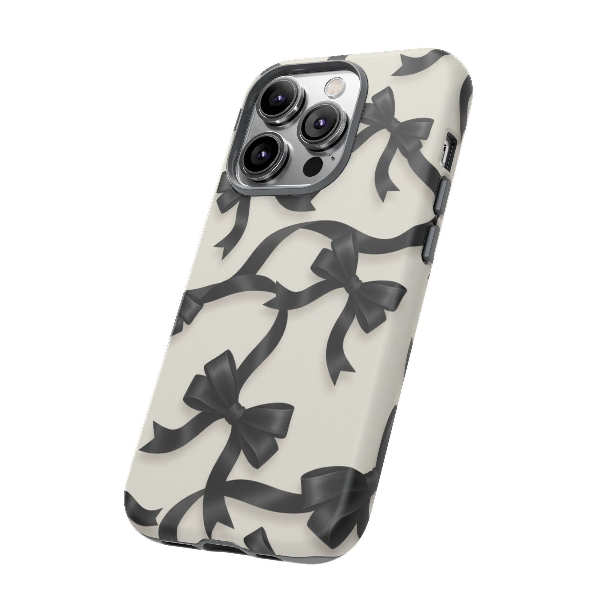 Add a touch of understated elegance to your everyday carry with this black ribbon bow phone case. Featuring flowing satin-style bows on a soft neutral background, this design blends vintage charm with modern minimalism for a look that’s both feminine and refined.