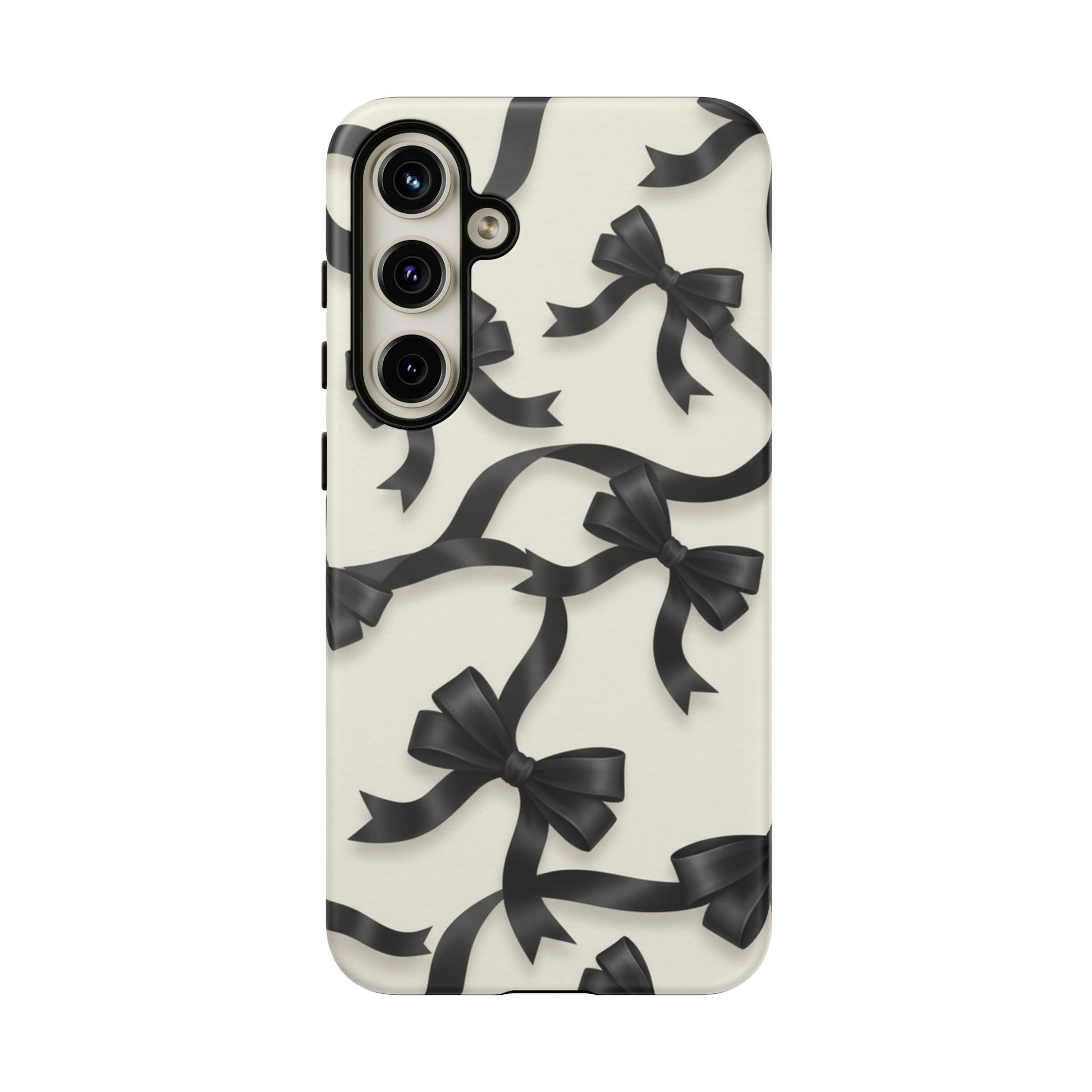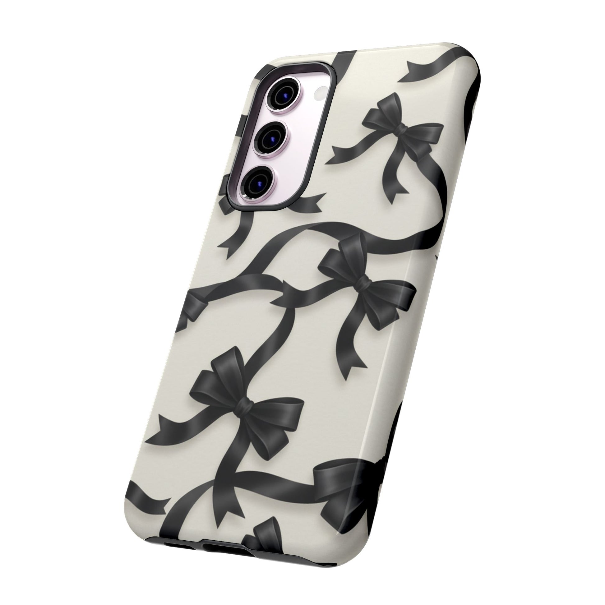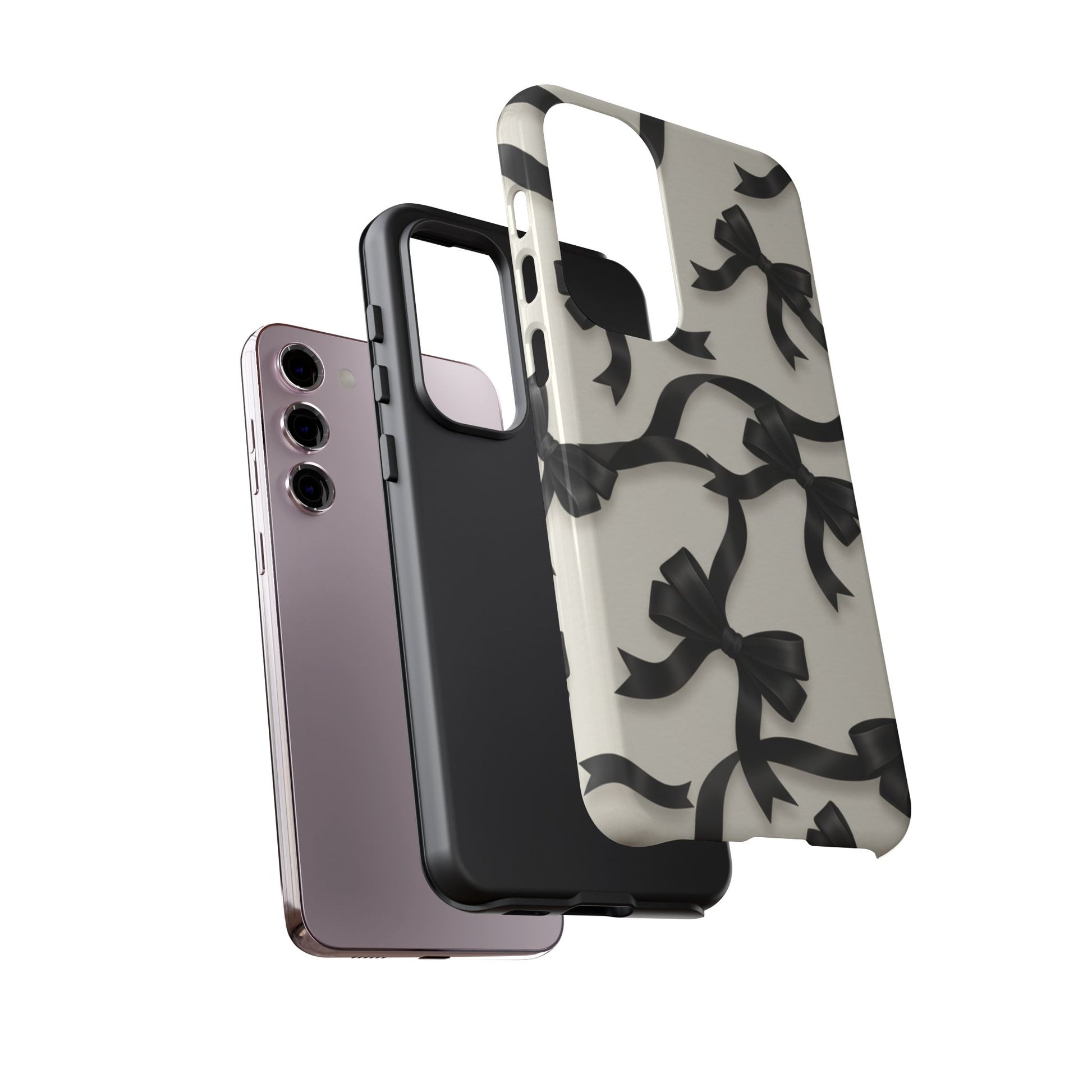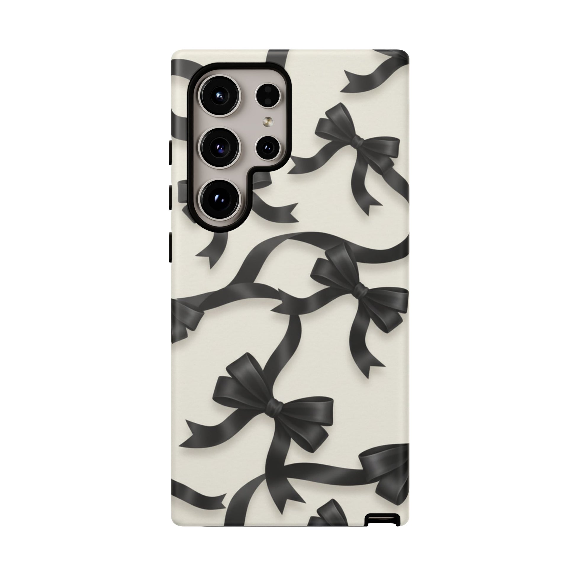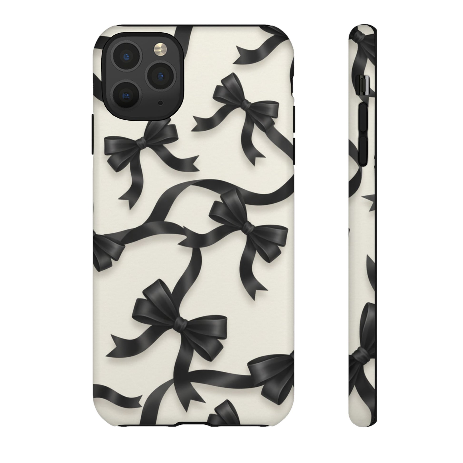 Add a touch of understated elegance to your everyday carry with this black ribbon bow phone case. Featuring flowing satin-style bows on a soft neutral background, this design blends vintage charm with modern minimalism for a look that’s both feminine and refined.