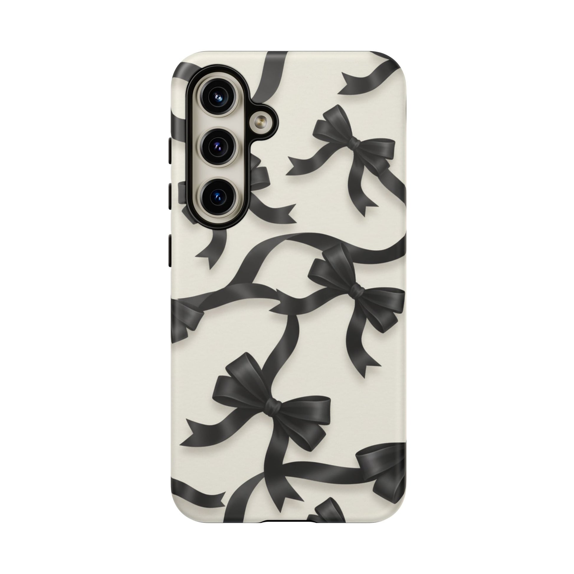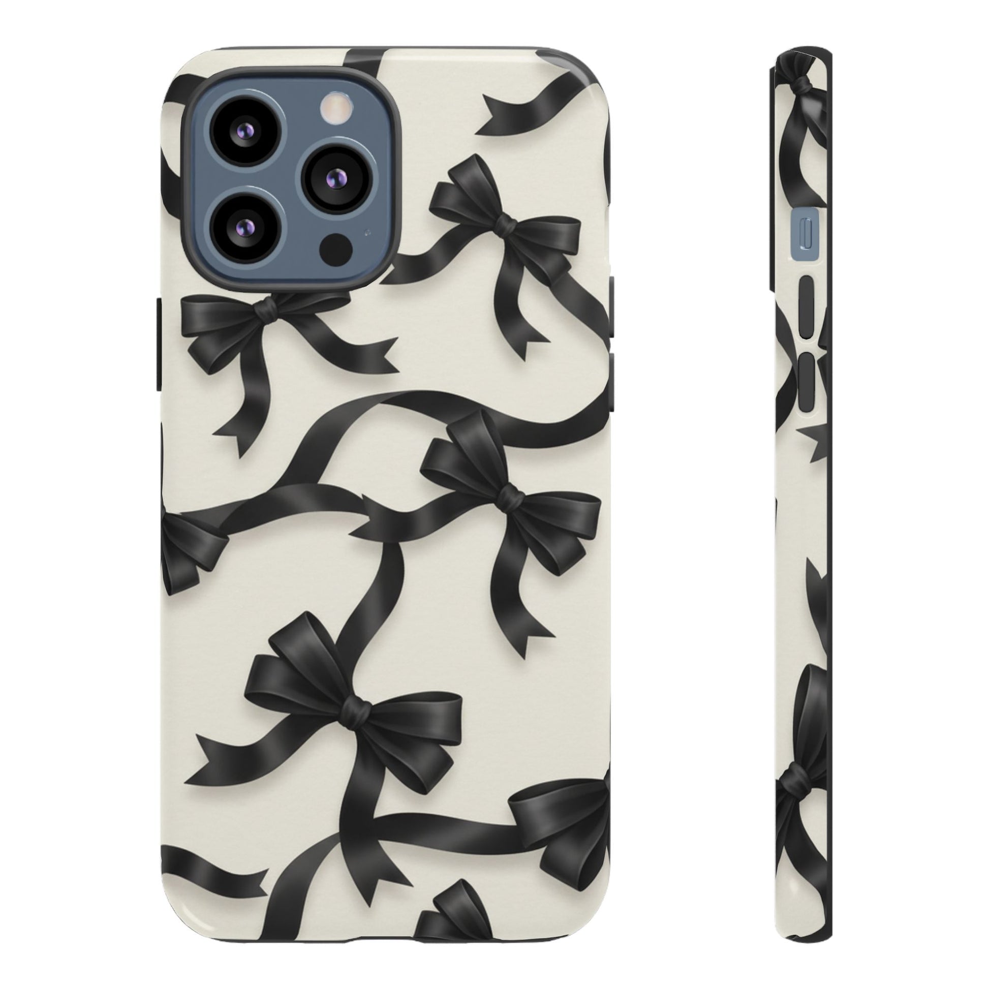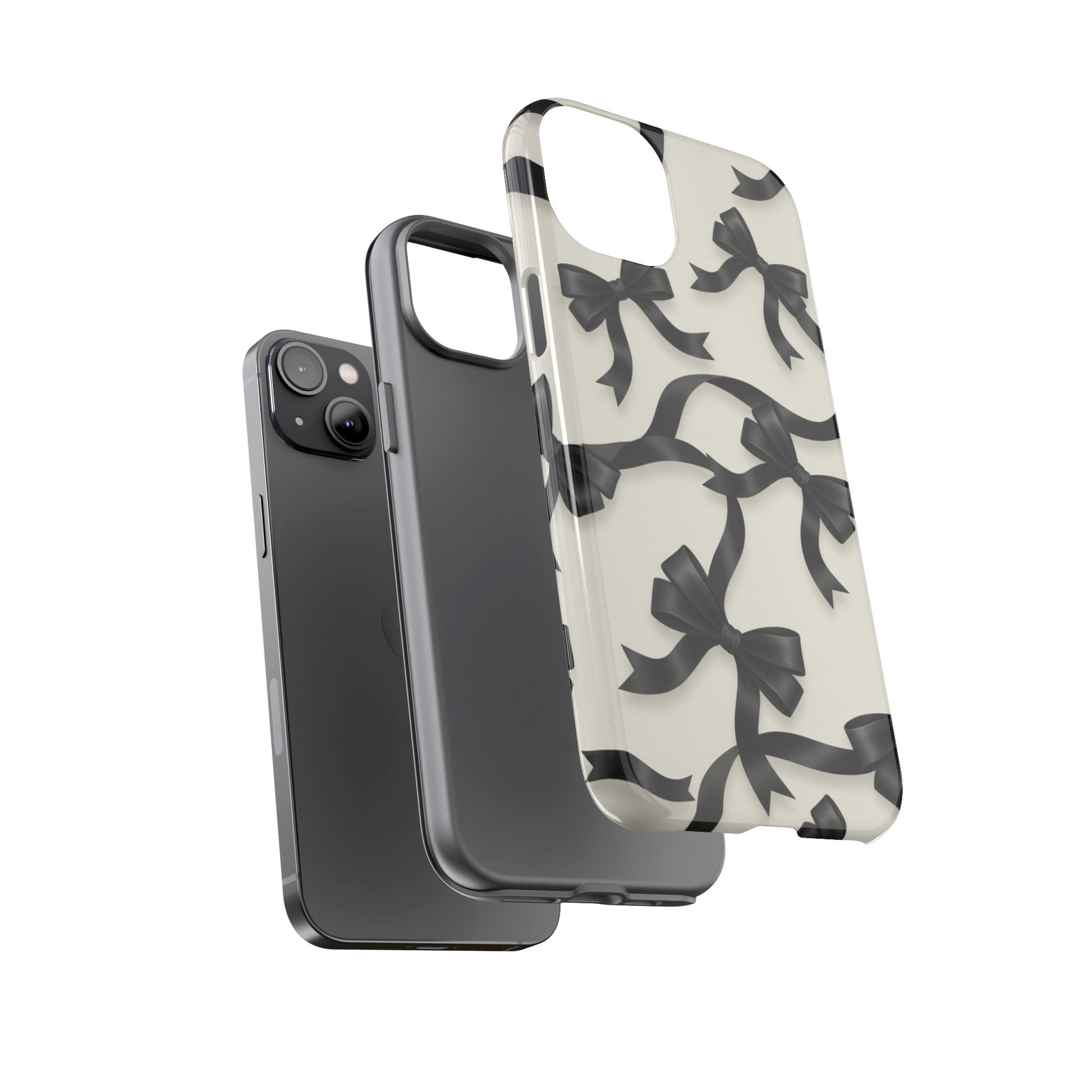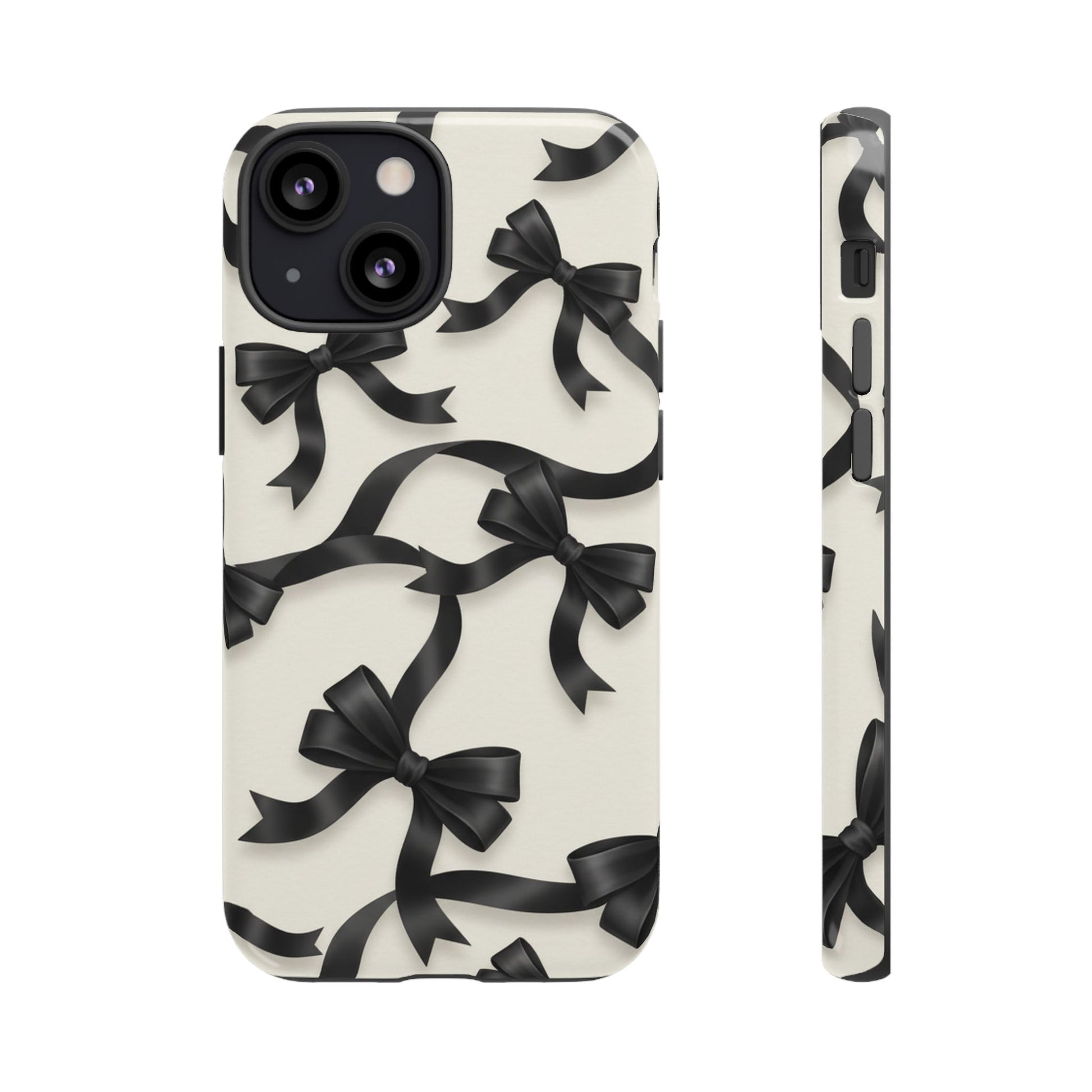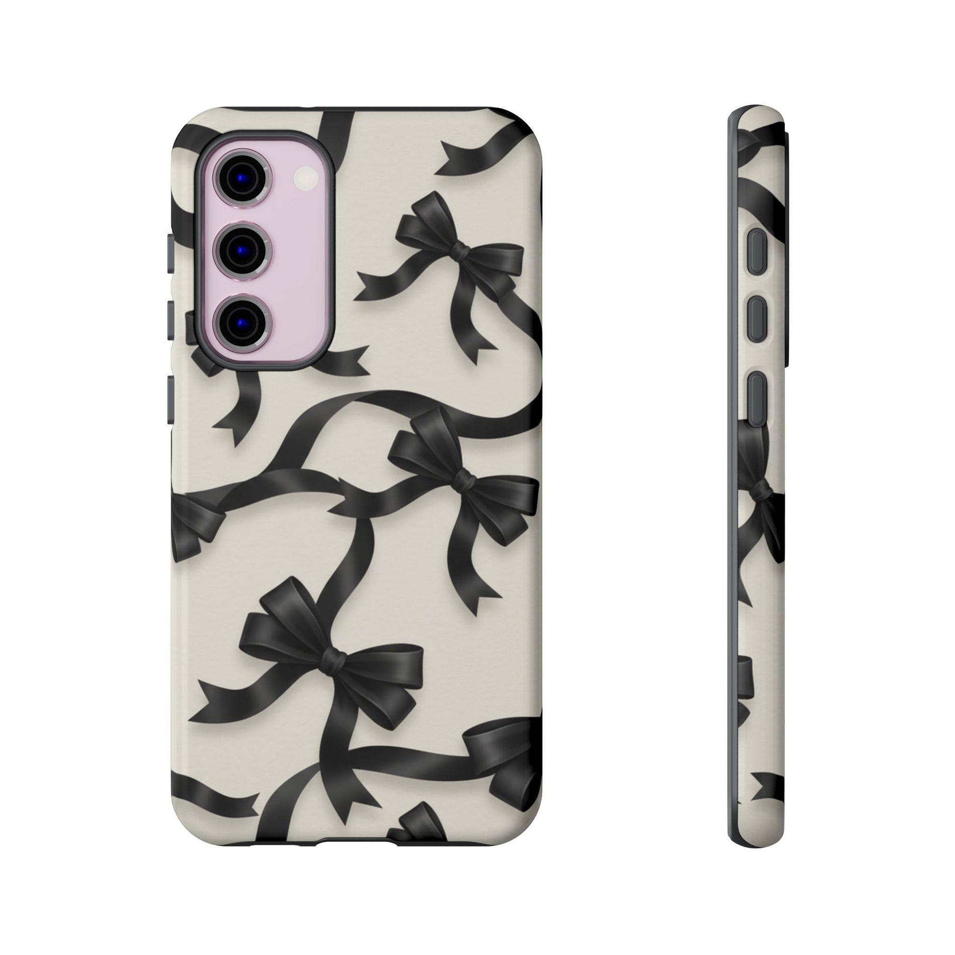 Add a touch of understated elegance to your everyday carry with this black ribbon bow phone case. Featuring flowing satin-style bows on a soft neutral background, this design blends vintage charm with modern minimalism for a look that’s both feminine and refined.
