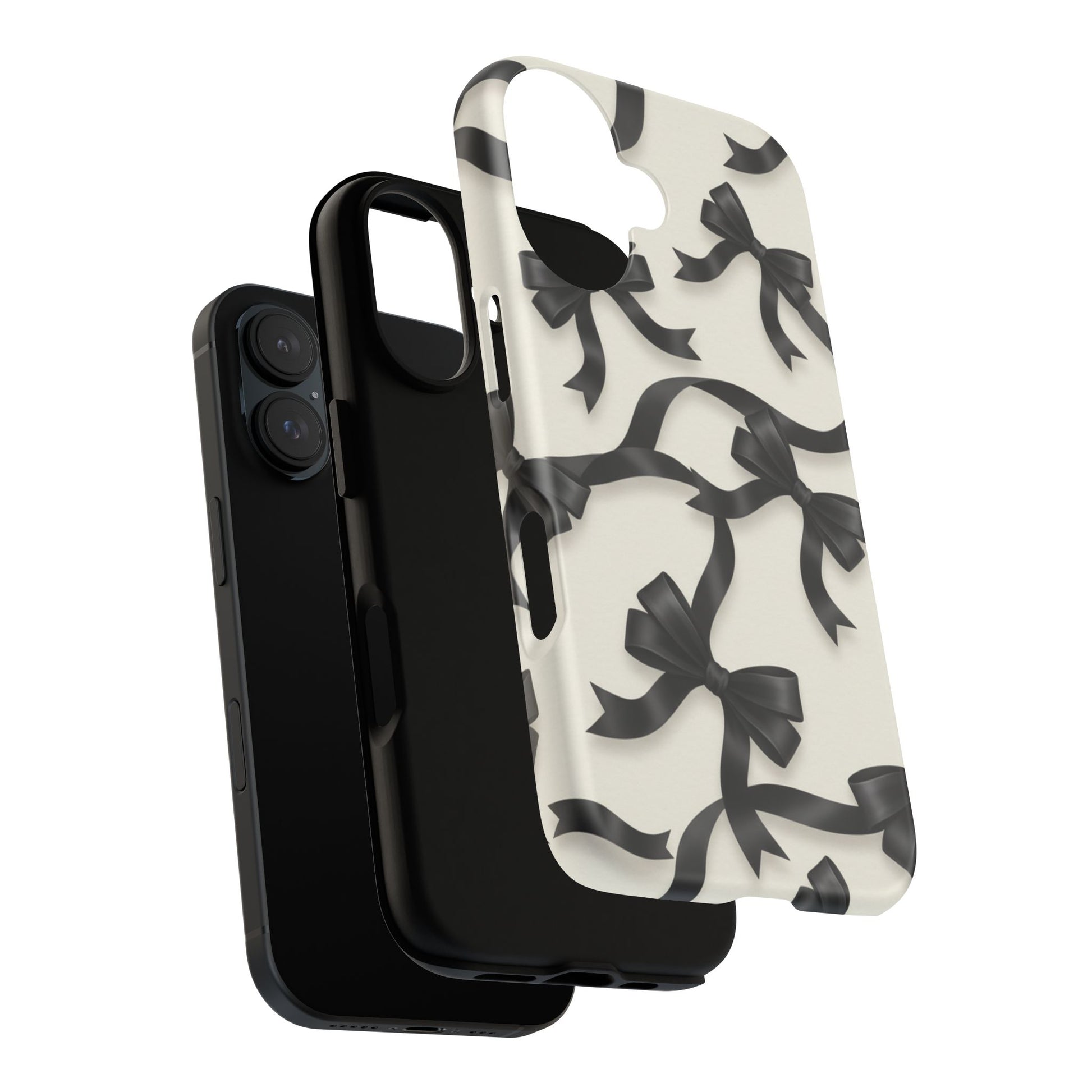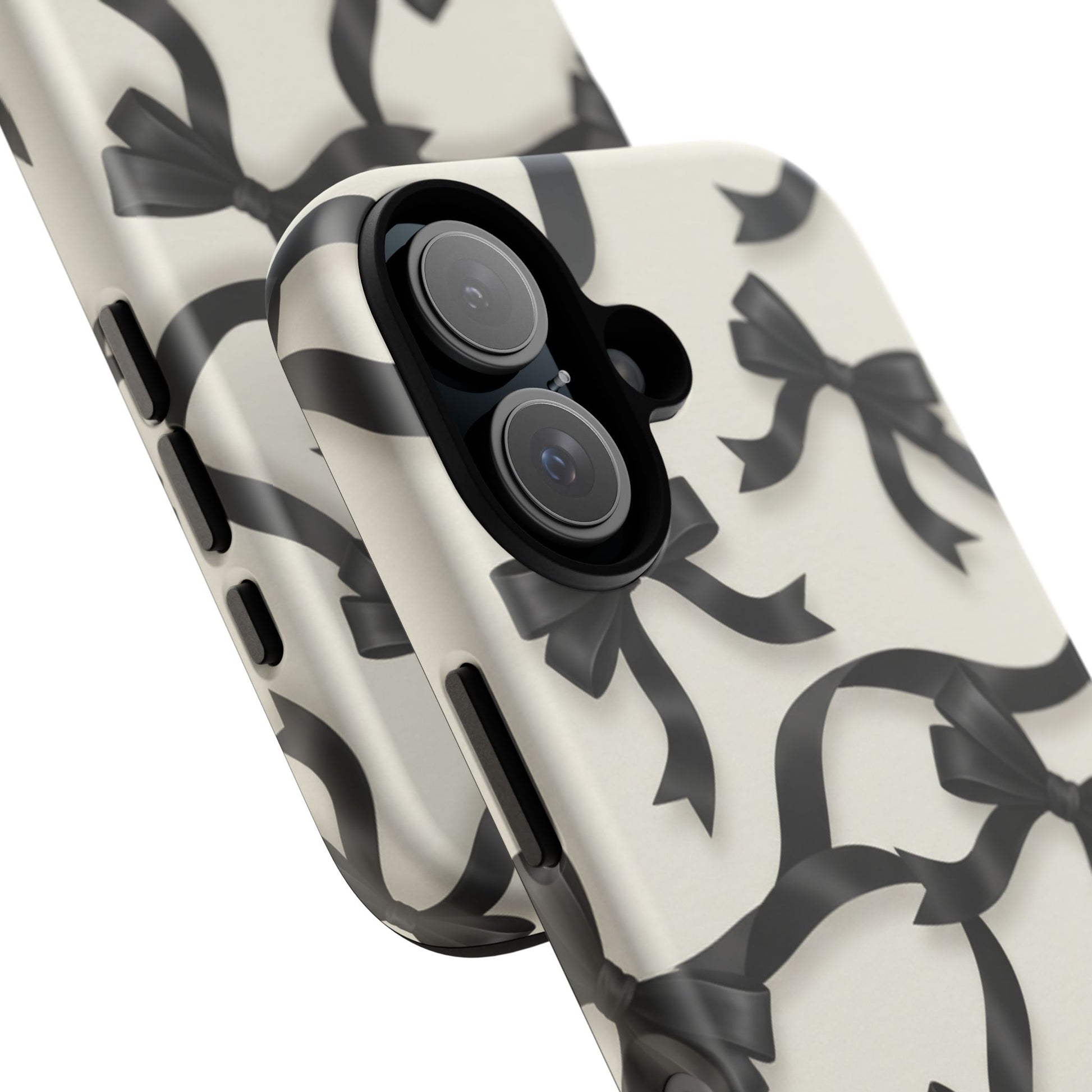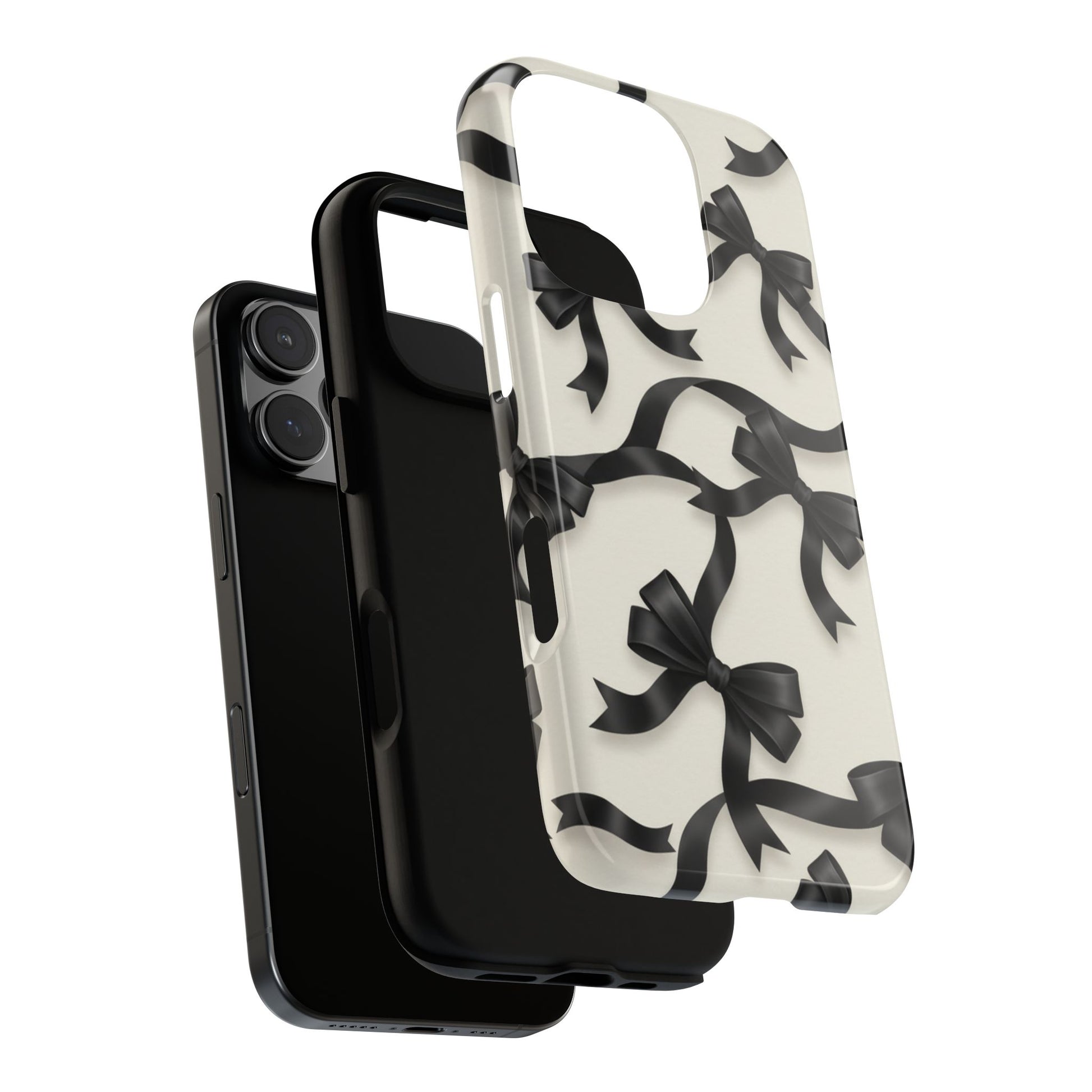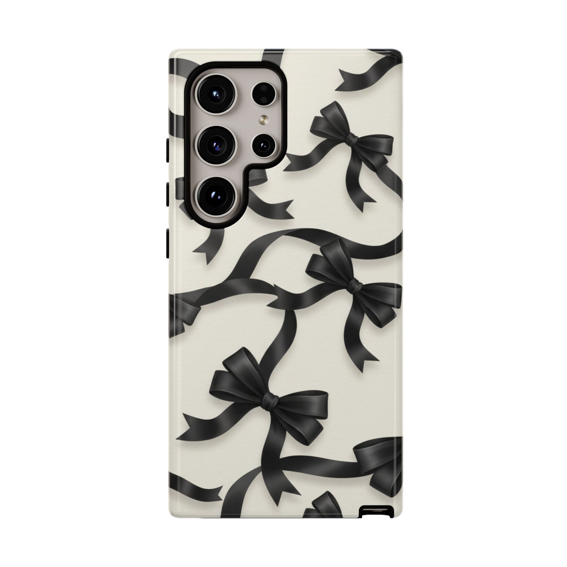 Add a touch of understated elegance to your everyday carry with this black ribbon bow phone case. Featuring flowing satin-style bows on a soft neutral background, this design blends vintage charm with modern minimalism for a look that’s both feminine and refined.