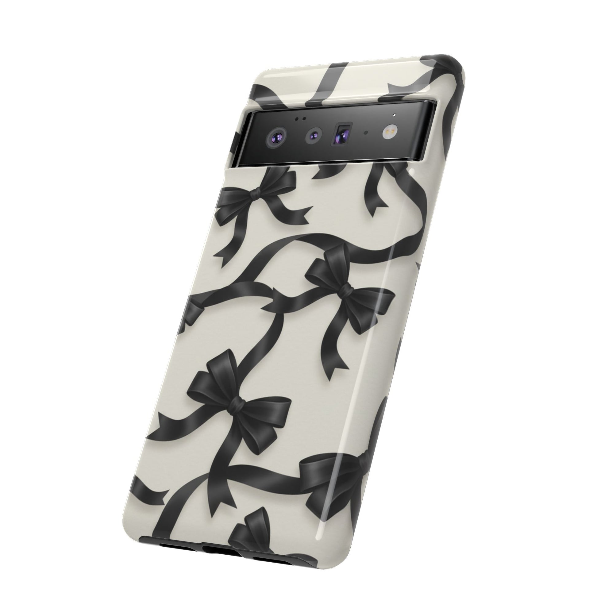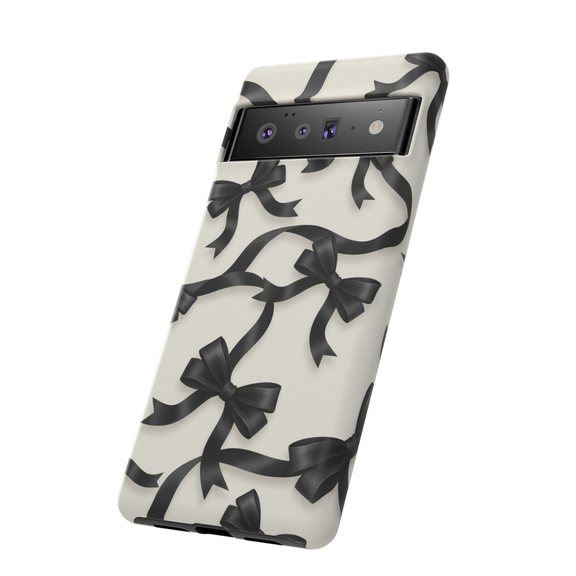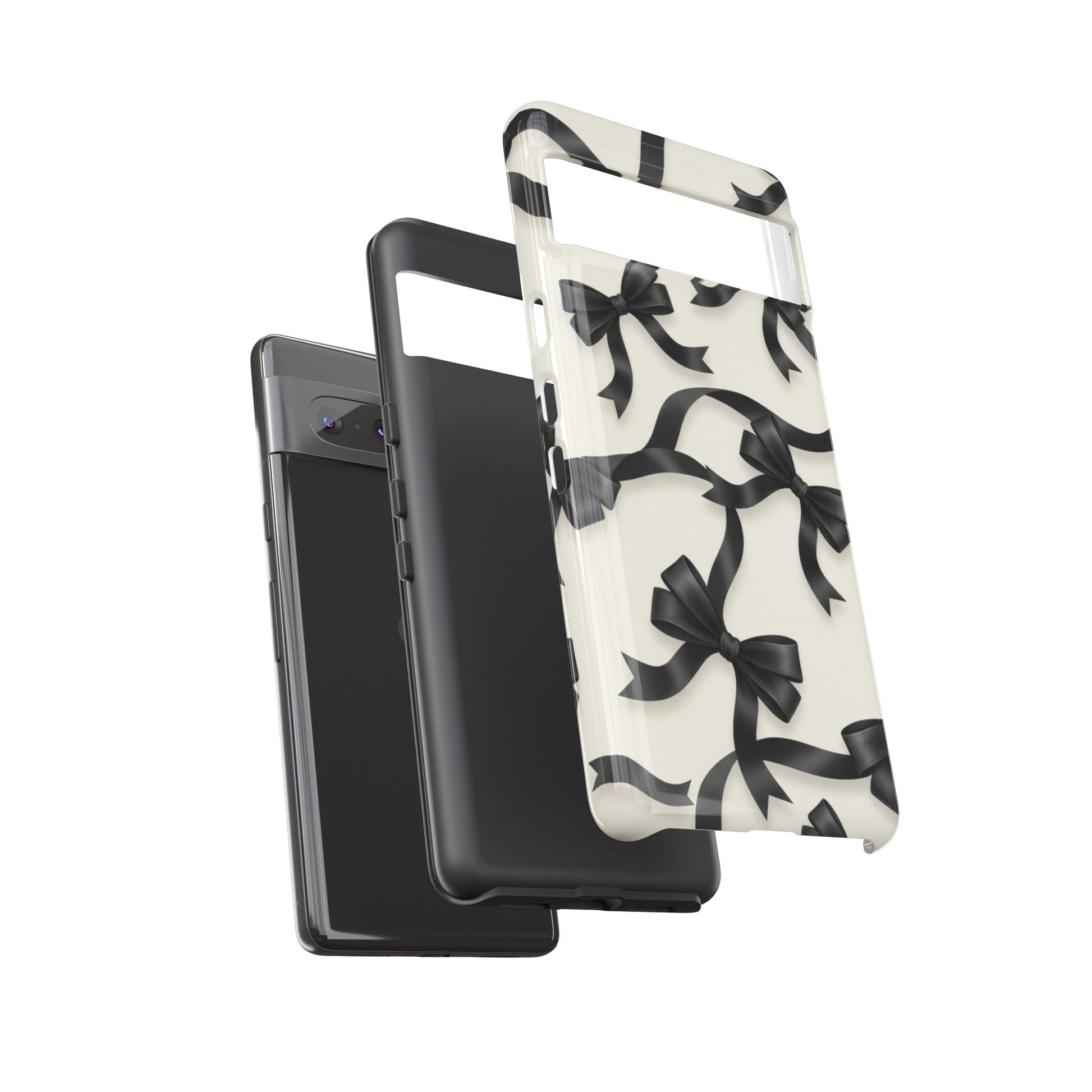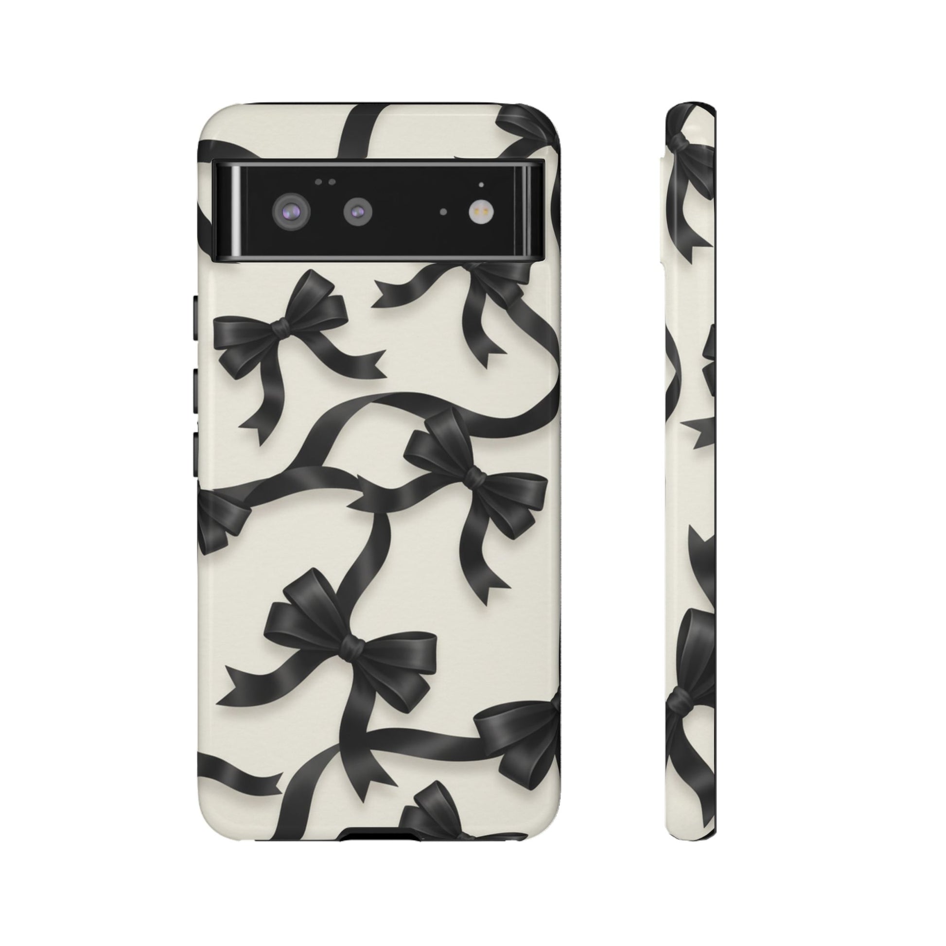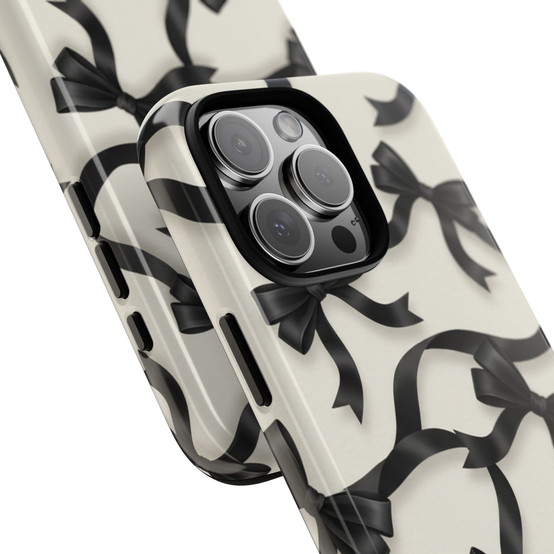 Add a touch of understated elegance to your everyday carry with this black ribbon bow phone case. Featuring flowing satin-style bows on a soft neutral background, this design blends vintage charm with modern minimalism for a look that’s both feminine and refined.