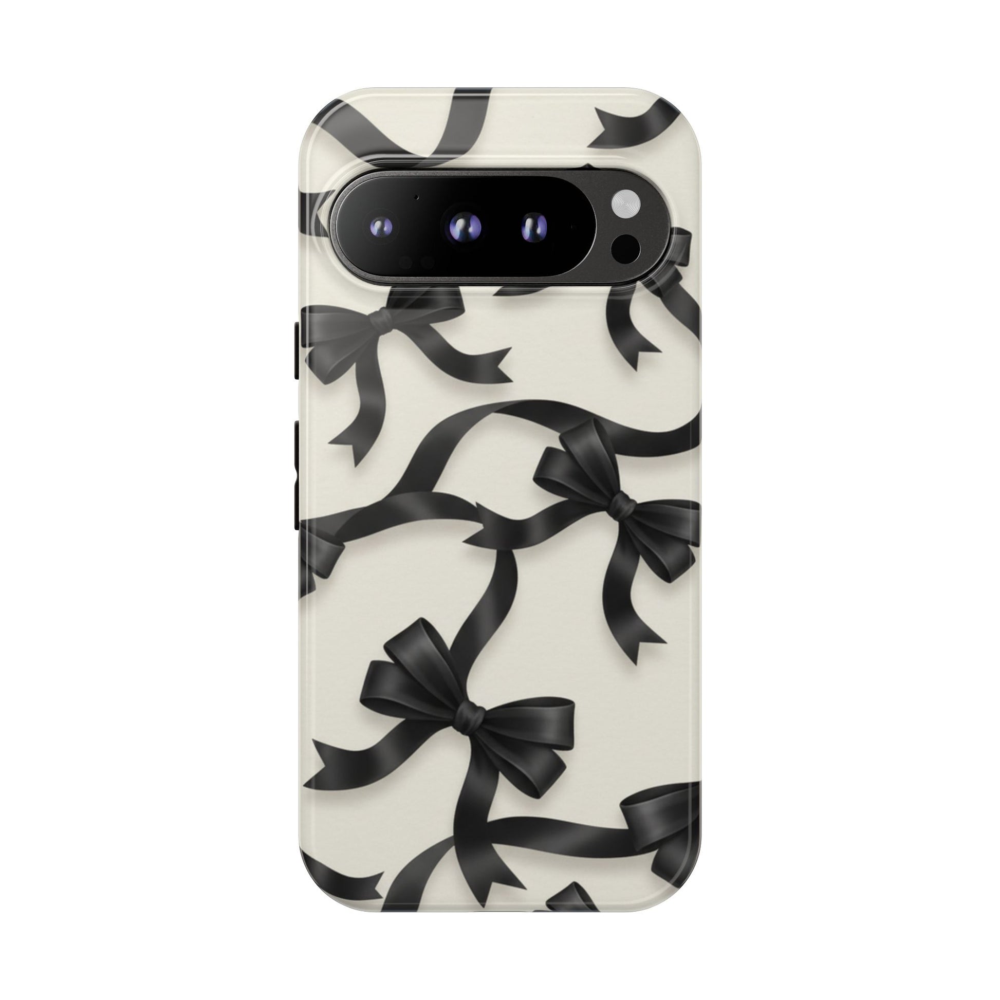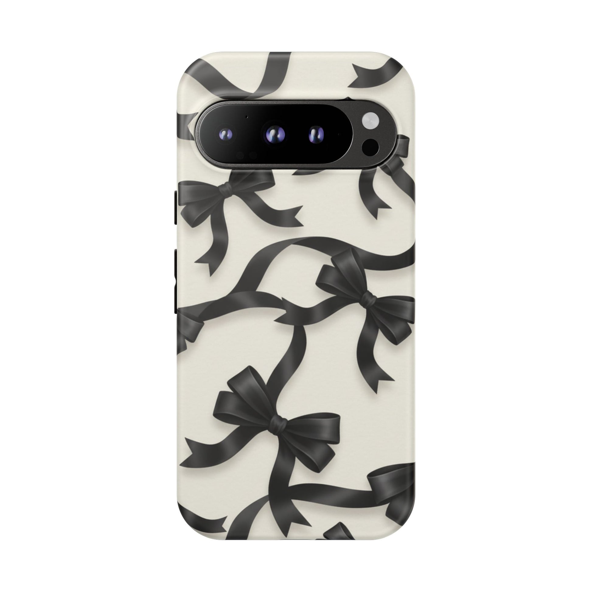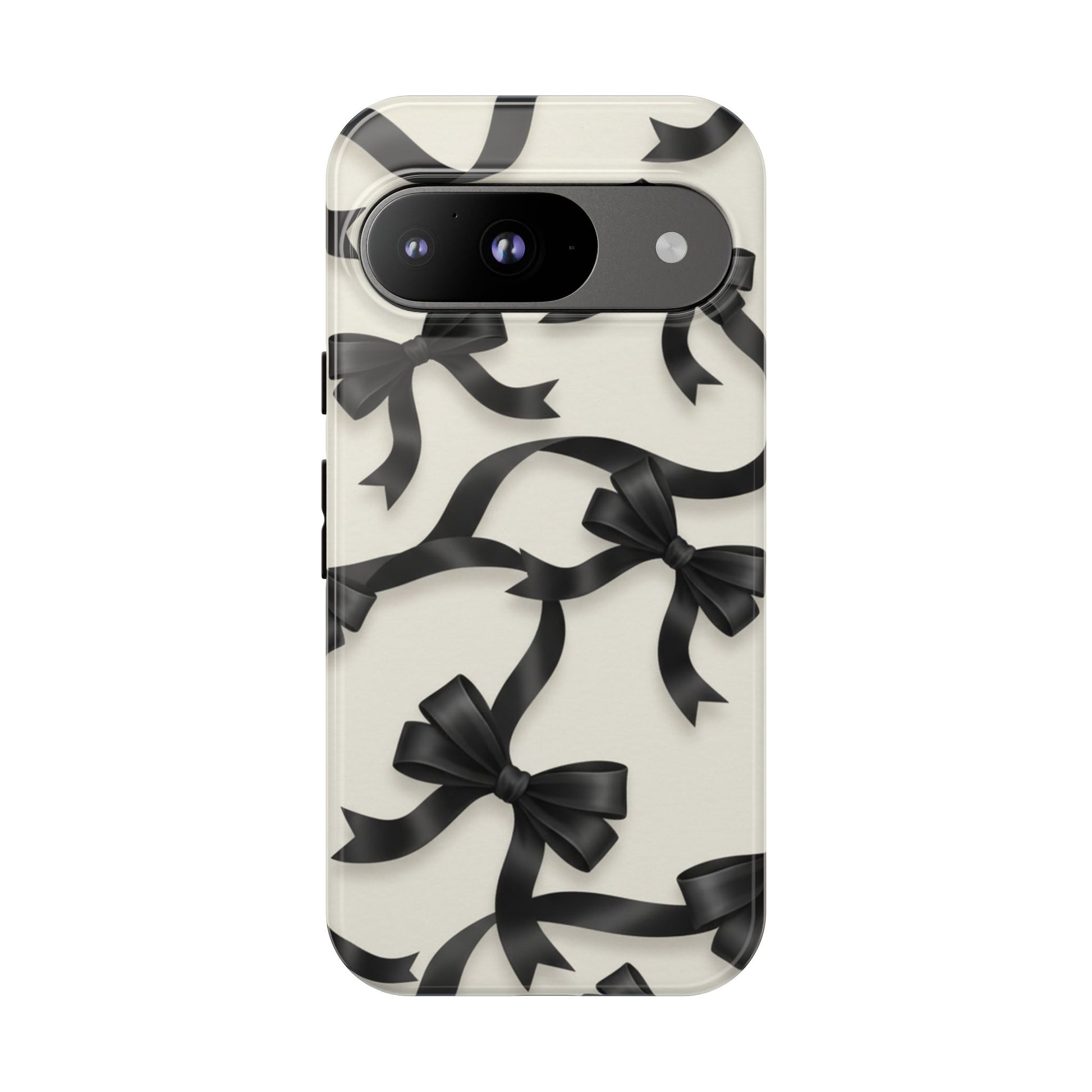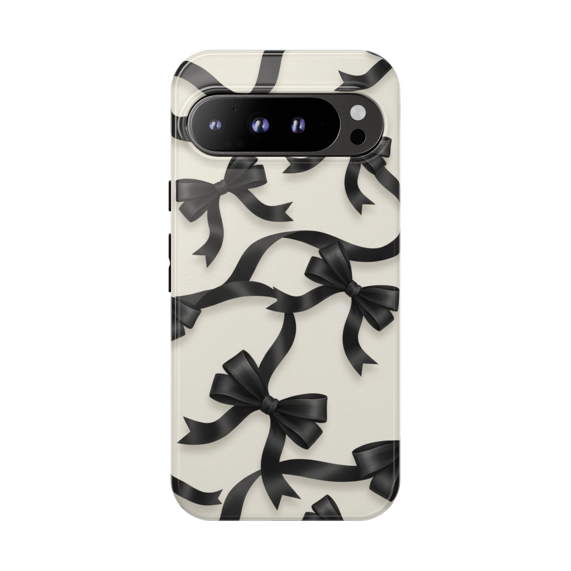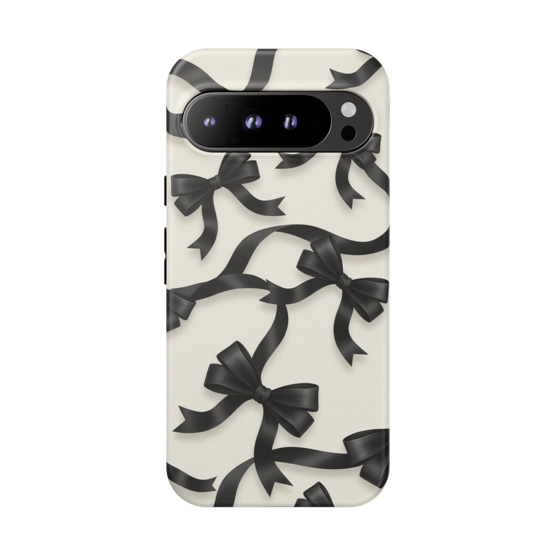 Add a touch of understated elegance to your everyday carry with this black ribbon bow phone case. Featuring flowing satin-style bows on a soft neutral background, this design blends vintage charm with modern minimalism for a look that’s both feminine and refined.
