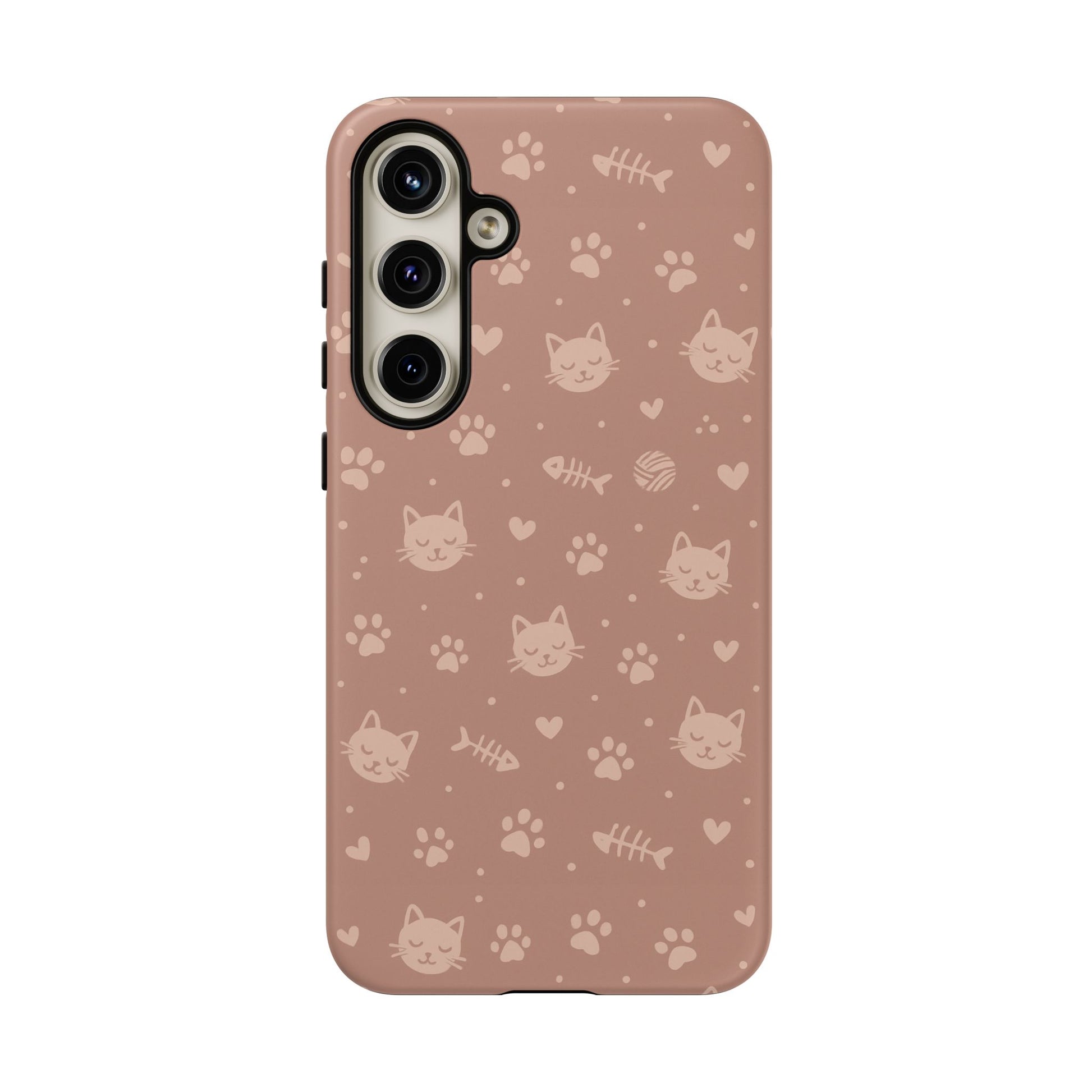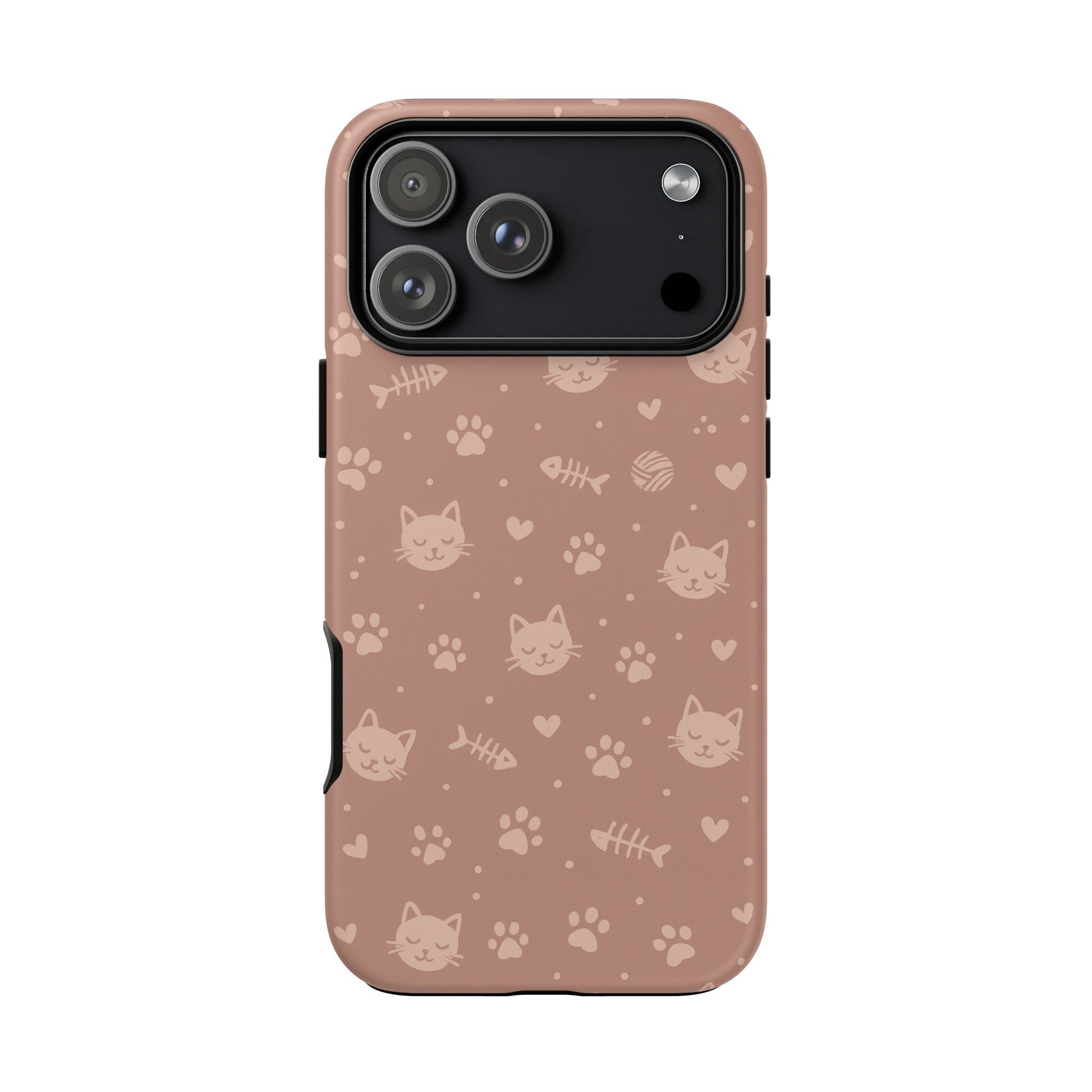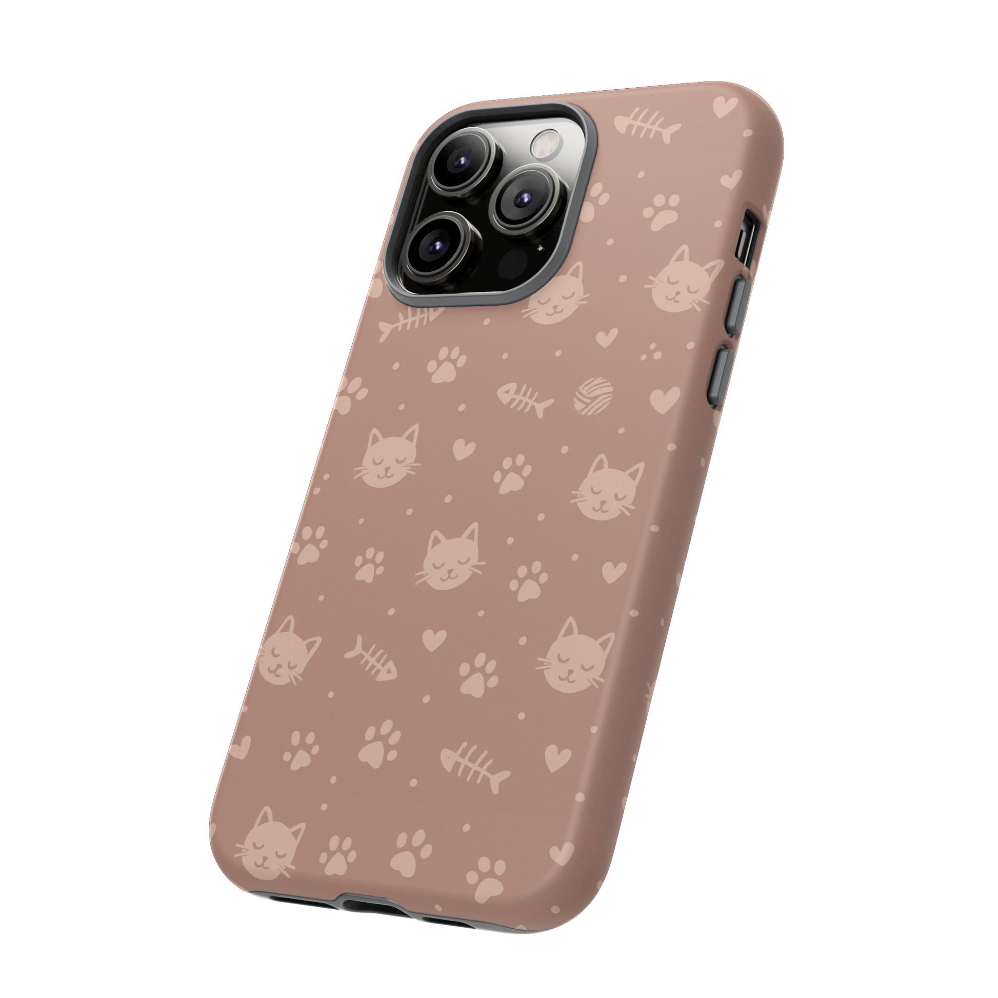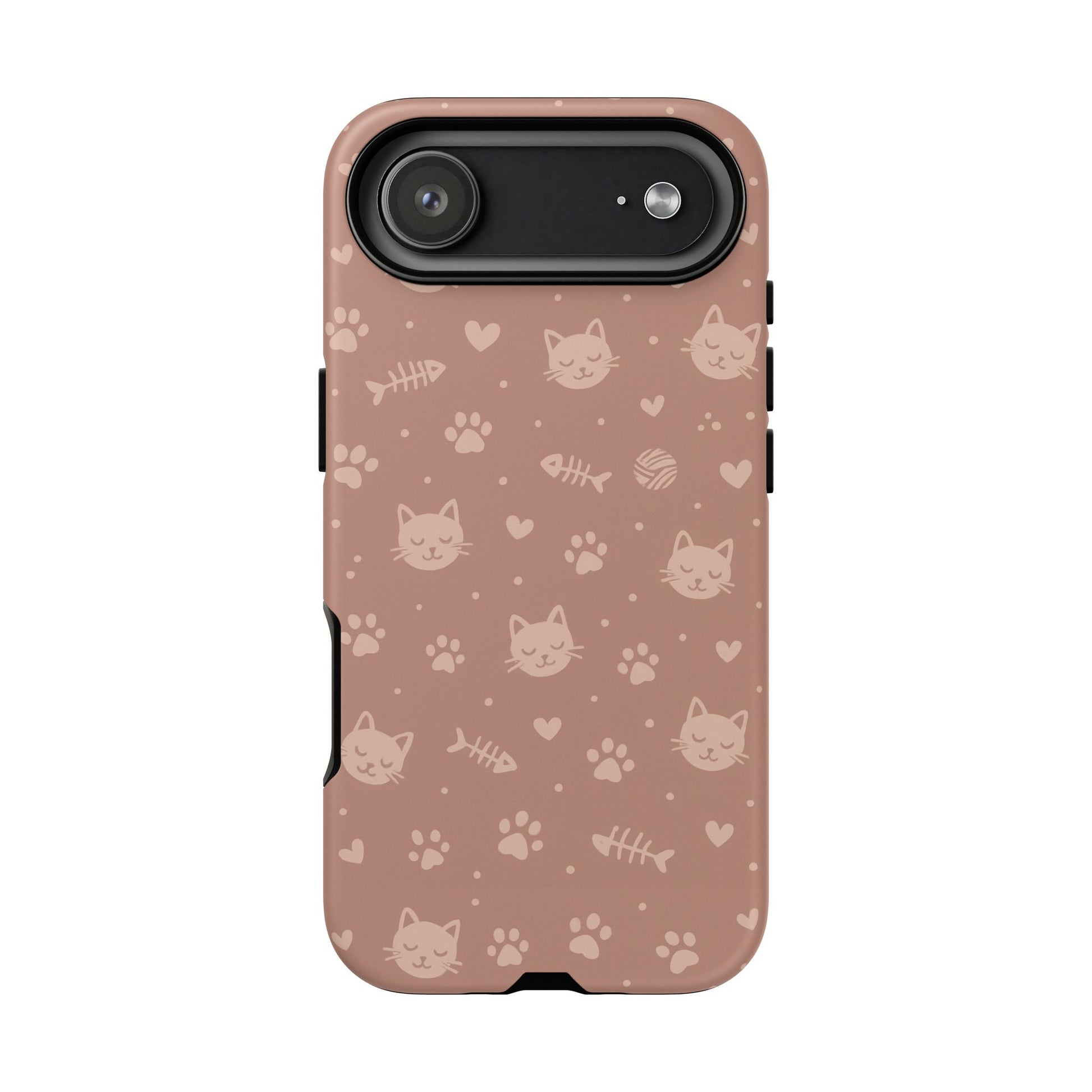 Add a cozy, playful touch to your everyday carry with this cute cat pattern phone case. Featuring an all-over design of smiling kittens, paw prints, yarn balls, and fishbones on a soft dusty-rose background, this case is perfect for cat lovers who want charm without sacrificing protection. The slim dual-layer construction combines a rigid polycarbonate shell with a shock-absorbing TPU liner to protect against drops, bumps, and scratches. Finished with a high-quality 3D wrap print and UV-resistant inks, the design stays vibrant while remaining lightweight and wireless-charging compatible. A sweet, stylish accessory made for daily use and endless compliments.