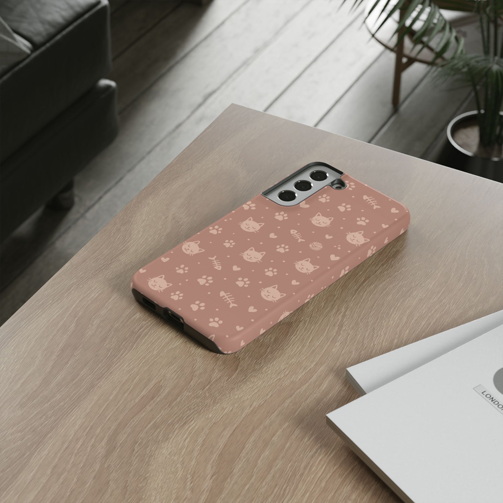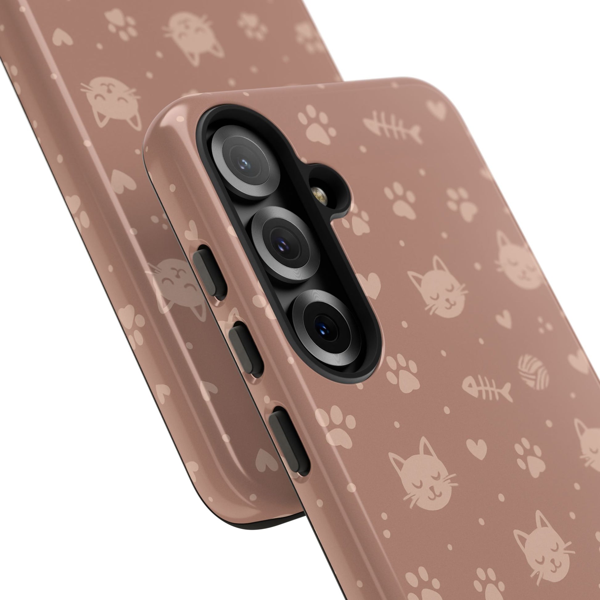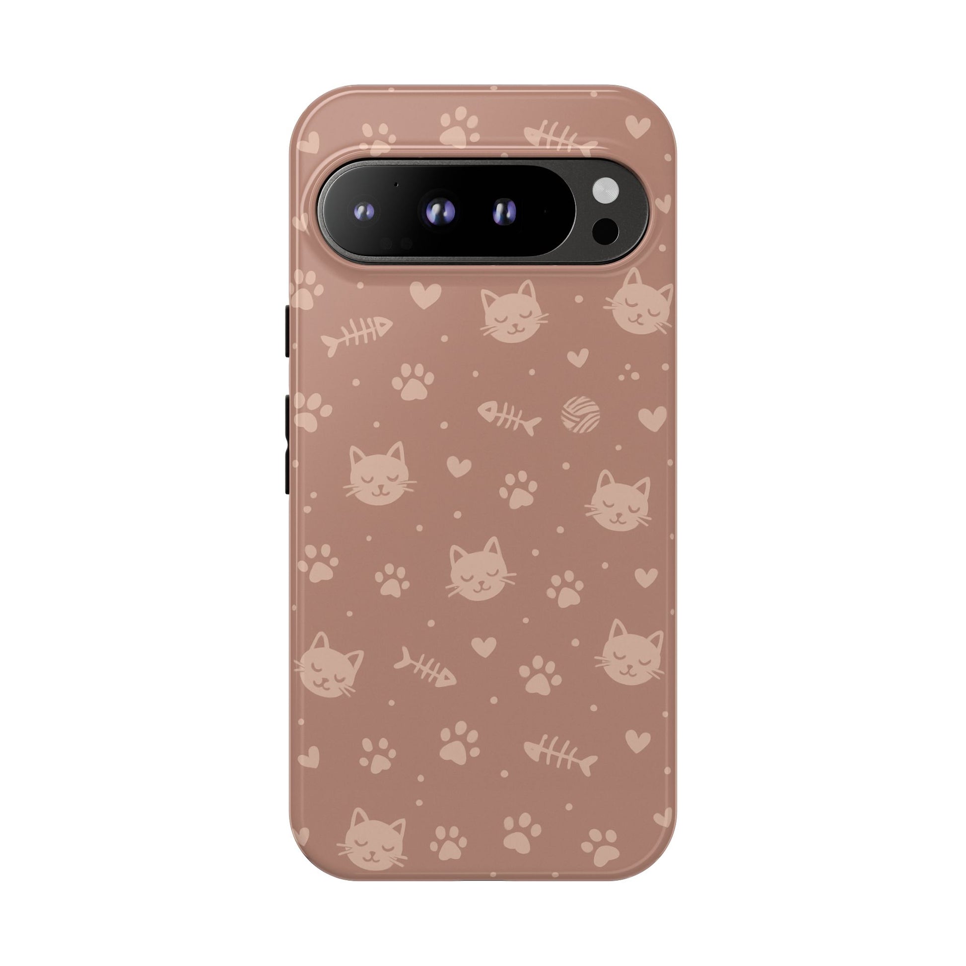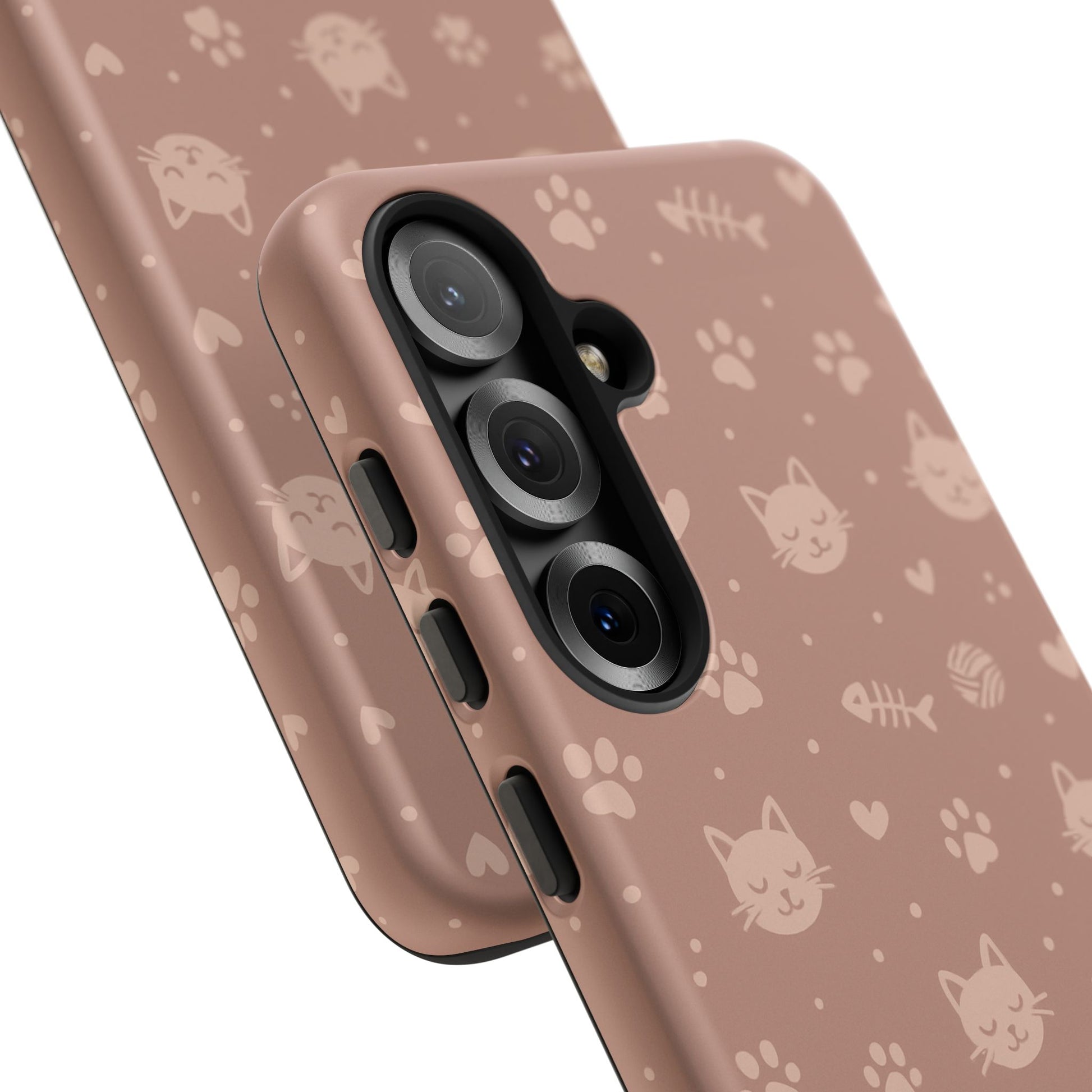 Add a cozy, playful touch to your everyday carry with this cute cat pattern phone case. Featuring an all-over design of smiling kittens, paw prints, yarn balls, and fishbones on a soft dusty-rose background, this case is perfect for cat lovers who want charm without sacrificing protection. The slim dual-layer construction combines a rigid polycarbonate shell with a shock-absorbing TPU liner to protect against drops, bumps, and scratches. Finished with a high-quality 3D wrap print and UV-resistant inks, the design stays vibrant while remaining lightweight and wireless-charging compatible. A sweet, stylish accessory made for daily use and endless compliments.
