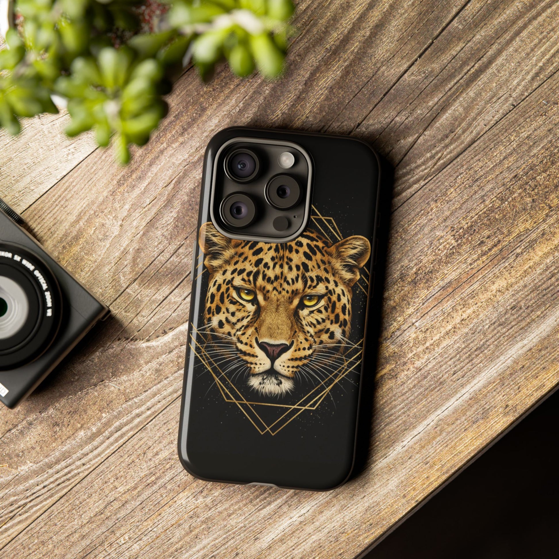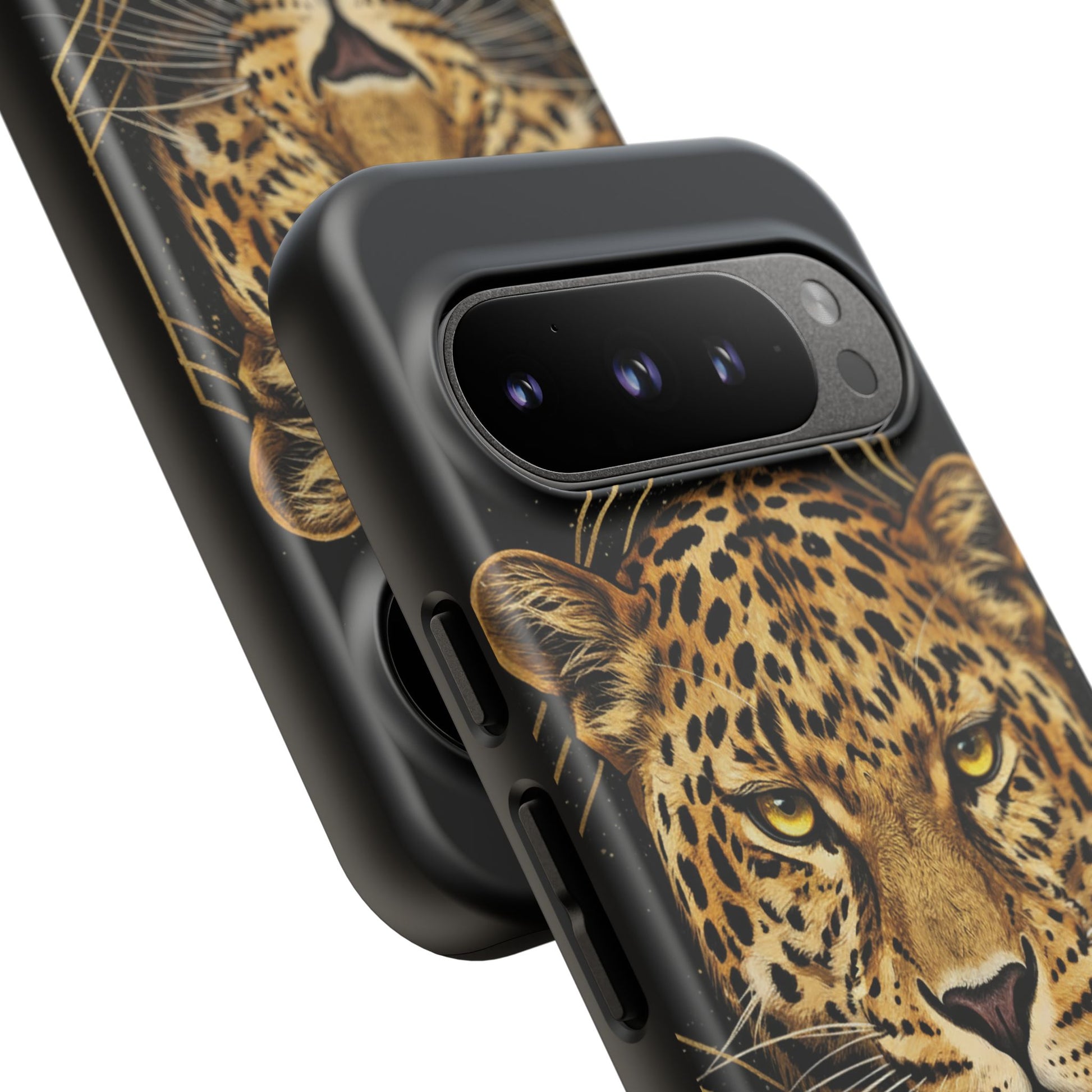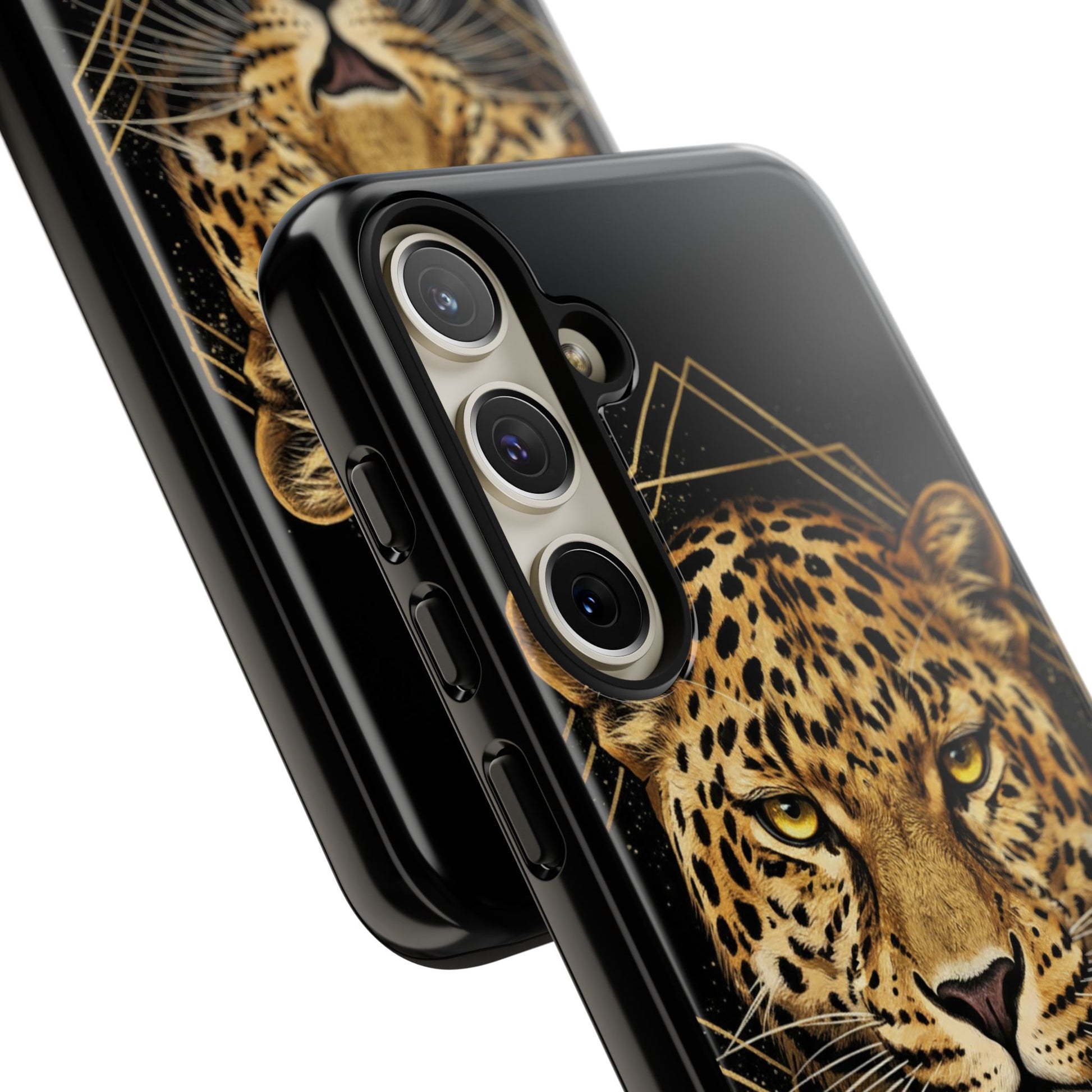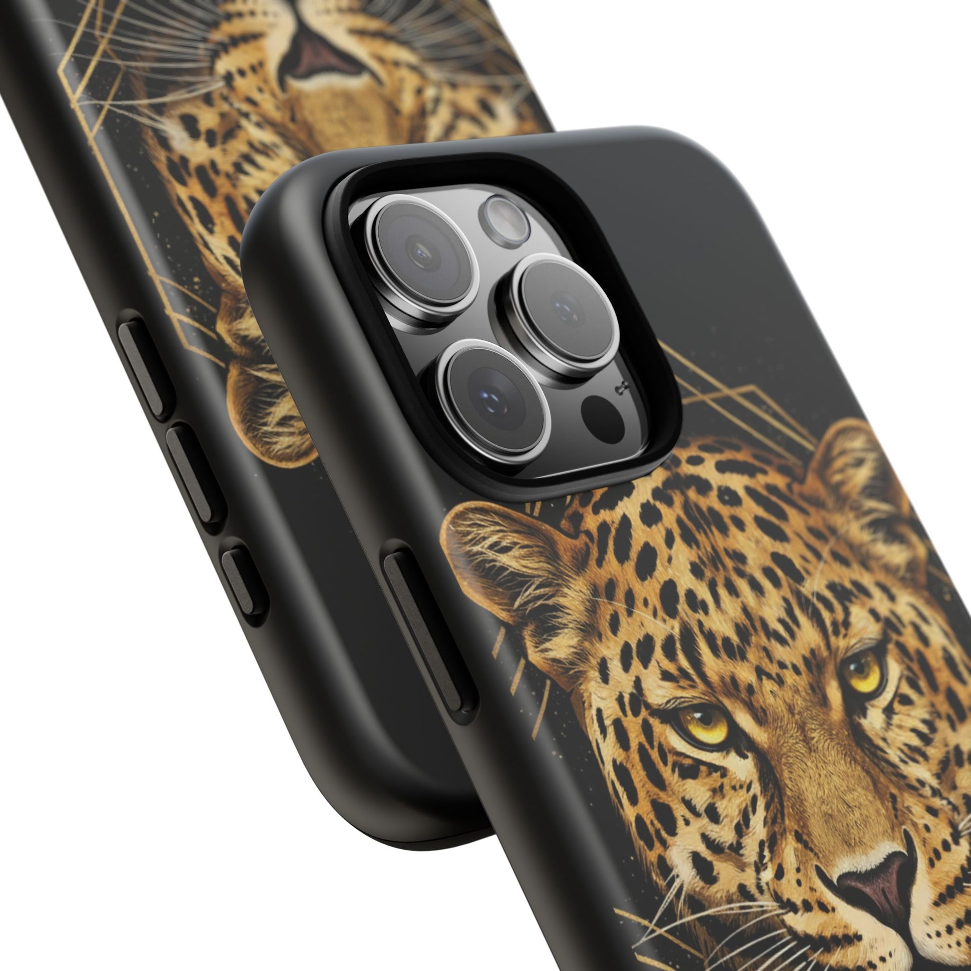 Leopard Head Geometric Phone Case – Black & Gold Luxe Tough Case