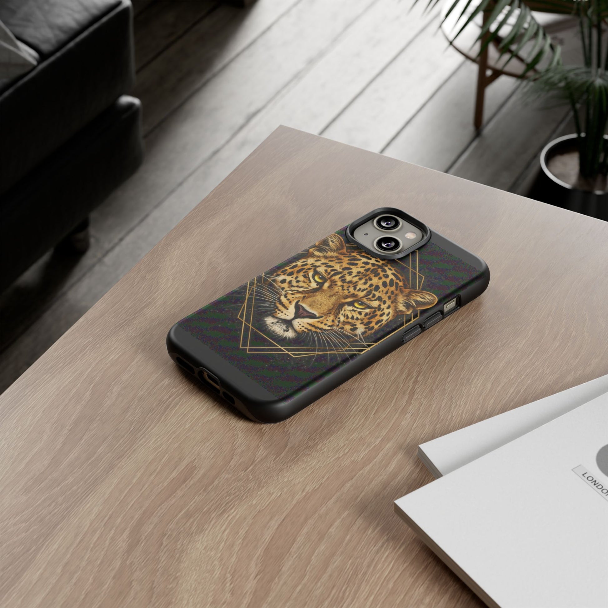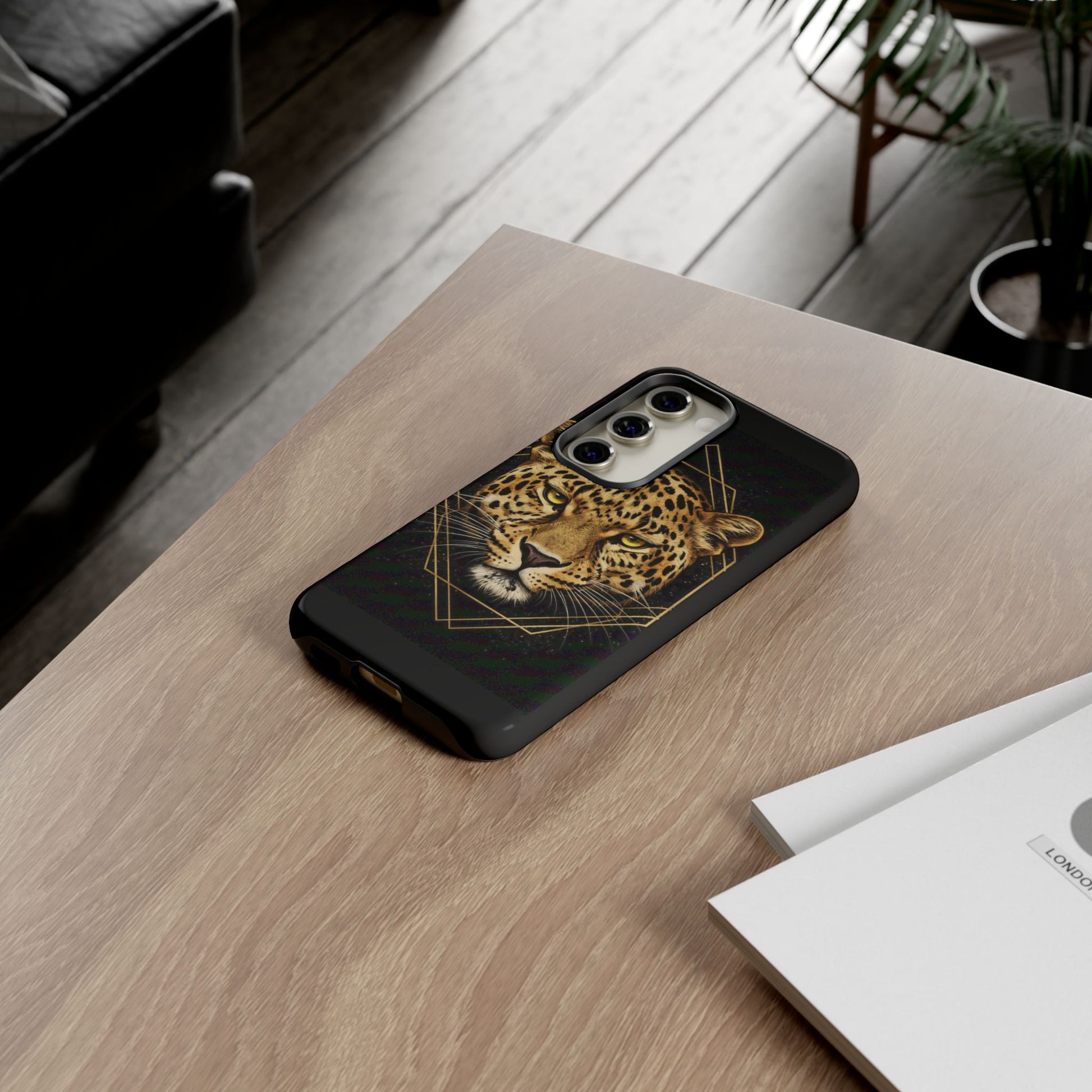This black and gold leopard phone case pairs striking wildlife imagery with clean geometric lines for a look that feels powerful, modern, and intentional.